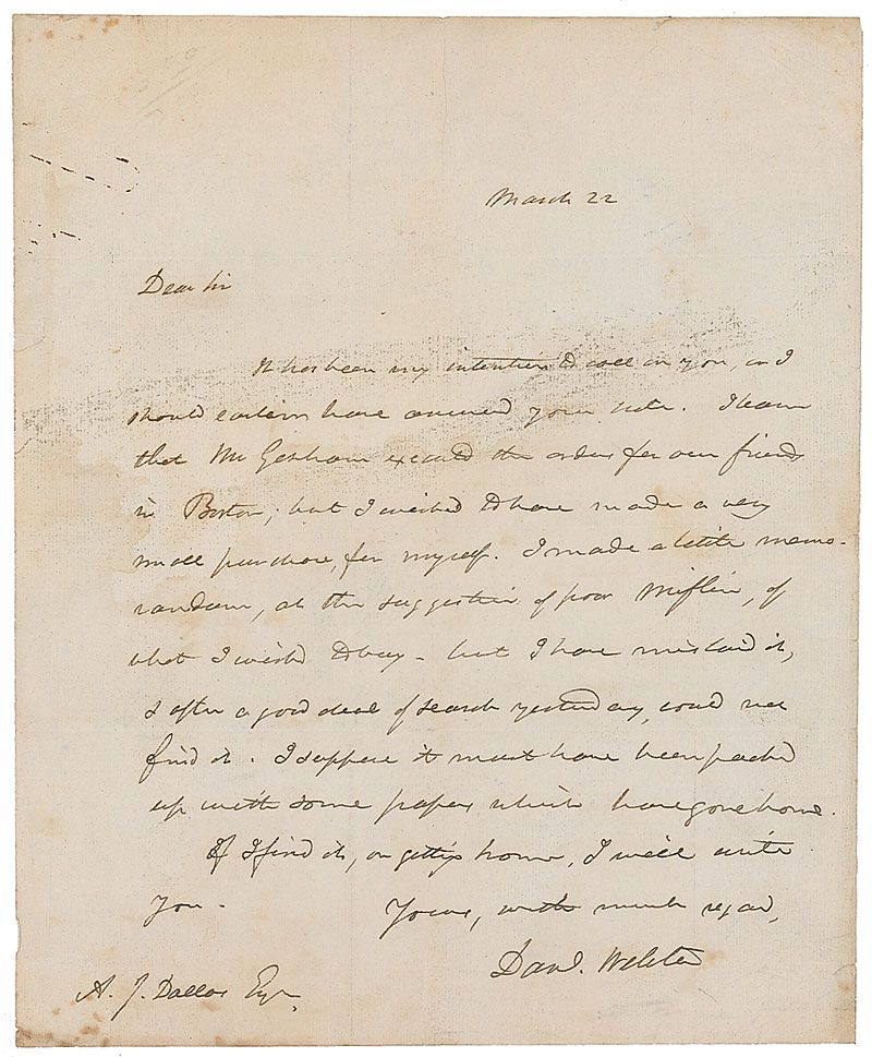 ALS signed “Dan’l Webster,” one page, 8 x 9.5, March 22. Letter to A. J. Dallas. In part: “I know that Mr. Gorham executed the order for our friends in Boston; but I wished to have made a very small purchase, for myself. I made a little memorandum, at the suggestion of poor Miflin, of what I wished…but I have mislaid it.” In very good condition, with intersecting folds, some scattered foxing and soiling, and rusty paperclip marks to left border.