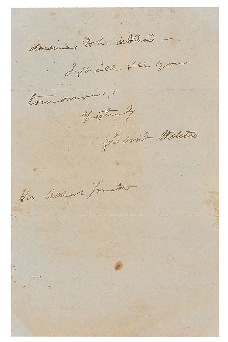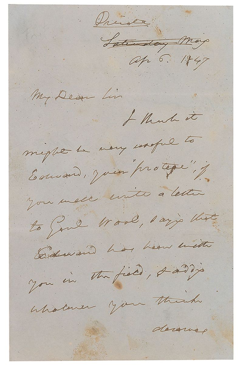 ALS signed “Dan’l Webster,” one page both sides, 4.5 x 7, April 6, 1847. Letter to a gentleman. In full: “I think it might be very useful to Edward, your ‘protege,’ if you will write a letter to Gen’l Wool, saying that Edward has been with you in the field, & adding whatever you think deserves to be added.” In very good condition, with scattered soiling and mirroring to ink.