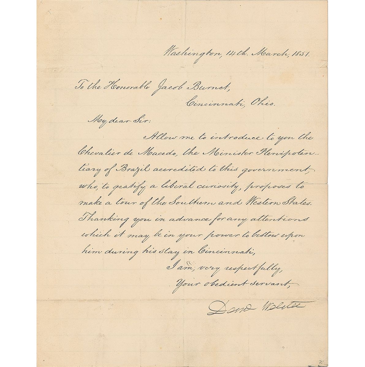 LS signed “Danl Webster,” one page, lightly-lined, 8 x 10, March 14, 1851. Letter of introduction to Jacob Burnet in Cincinnati. In part: “Allow me to introduce to you the Chevalier de Macedo, the Minister Plenipotentiary of Brazil…who, to gratify a liberal curiosity, proposes to make a tour of the Southern and Western States. Thanking you in advance for any attentions which it may be in your power to bestow upon him during his stay in Cincinnati.” In very good condition, with intersecting folds, a couple passing through portions of signature, and several partial fold separations.