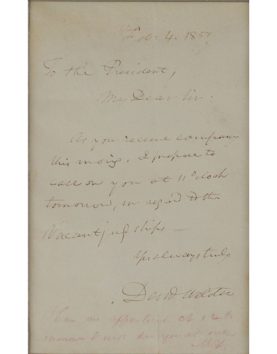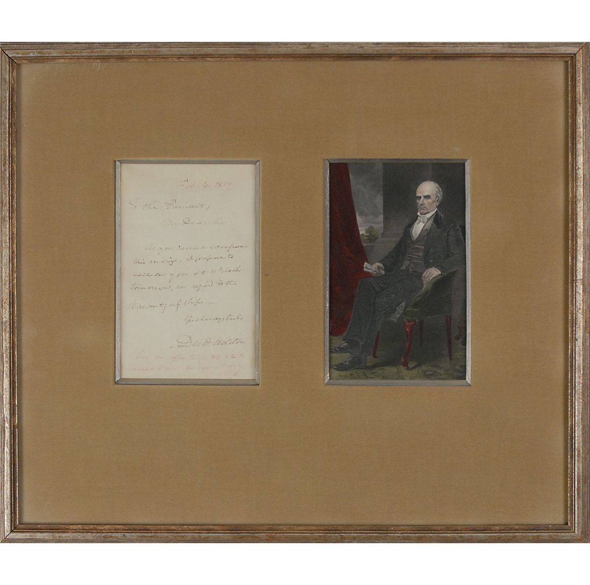 ALS signed “Danl Webster,” one page, 4 x 6.5, February 4, 1857. Letter to President Millard Fillmore. In full: “As you receive company this morning. I propose to call on you at 11 o’clock tomorrow in regard to the vacant judgeships.” At the bottom, Fillmore has responded, “I have an appointment at 12 tomorrow & will see you at one. M. F.” Cloth matted and framed with a color portrait of Webster to an overall size of 18.25 x 16. In fine condition, with intersecting folds, one through a single letter of Webster’s signature, and a bit of light toning.