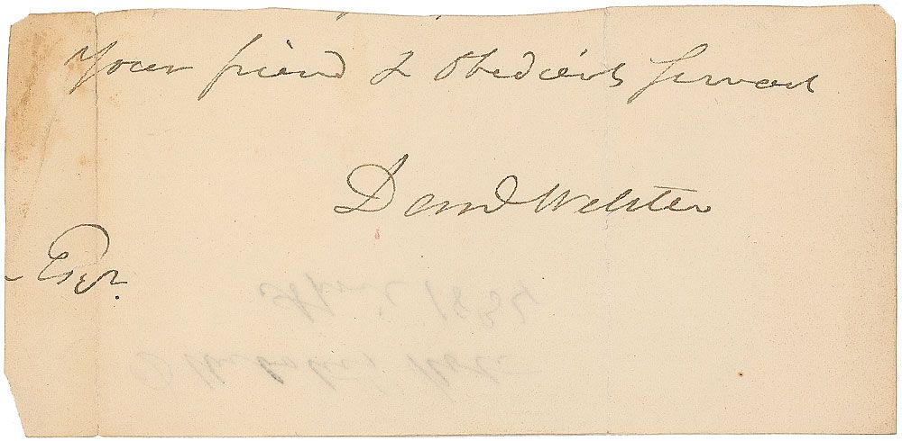 Ink signature, “Your friend & obedient servant, Dan’l Webster,” on an off-white 5.5 x 2.5 slip clipped from the close of a letter. Two vertical folds (one passing through a single letter of the signature and one partial separation passing through the beginning of the sentiment), otherwise fine condition.