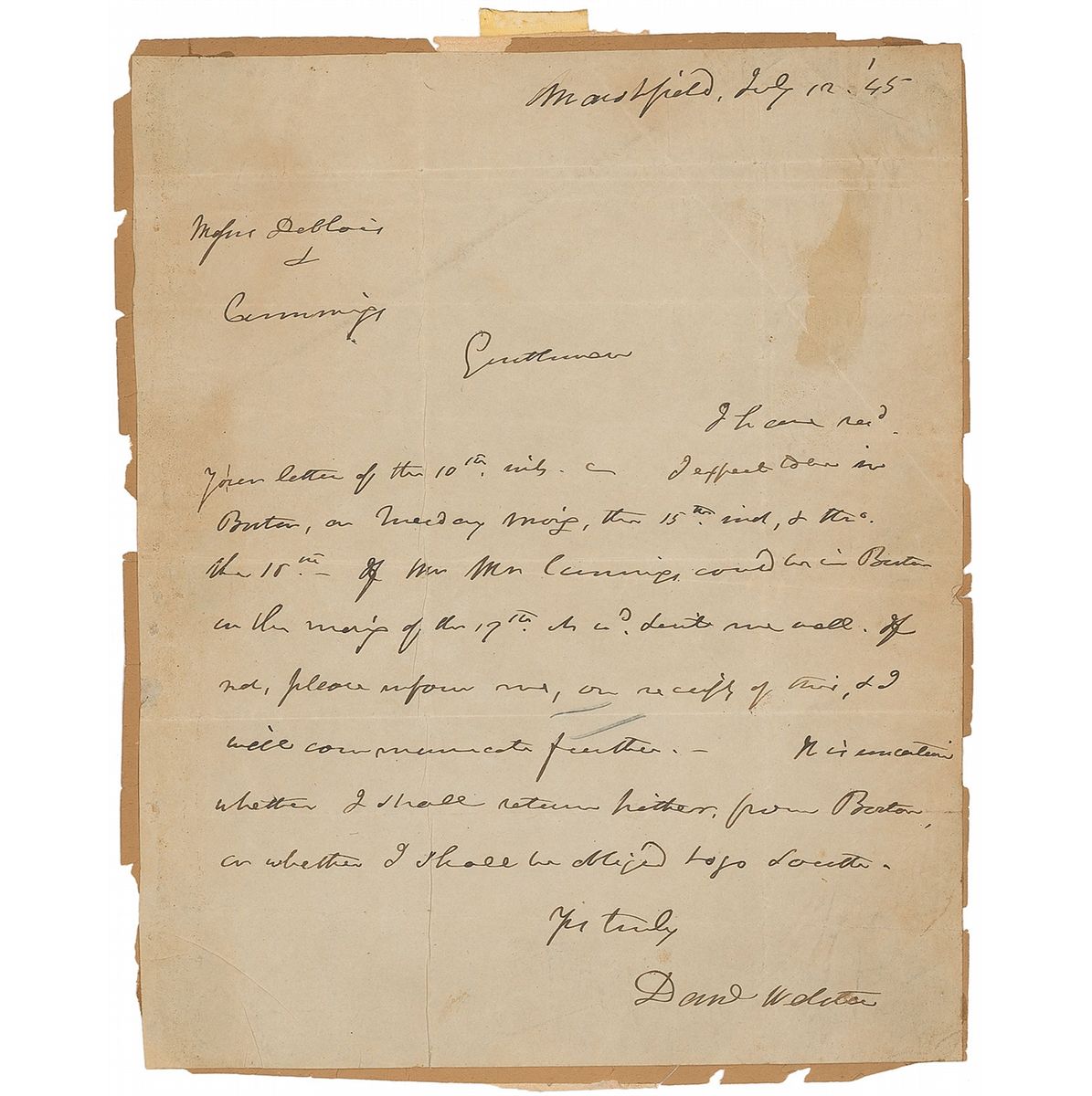 ALS signed “Dan’l Webster,” one page, 7.5 x 9.25, July 12, 1845. Letter to two gentlemen. In part: “I expect to be in Boston on Tuesday…It is uncertain whether I shall return hither from Boston or whether I shall be obliged to go South.” Affixed to a brittle scrapbook page. In very good condition, with numerous intersecting folds and scattered creases, and a few light stains. Accompanied by an attractive slipcase.