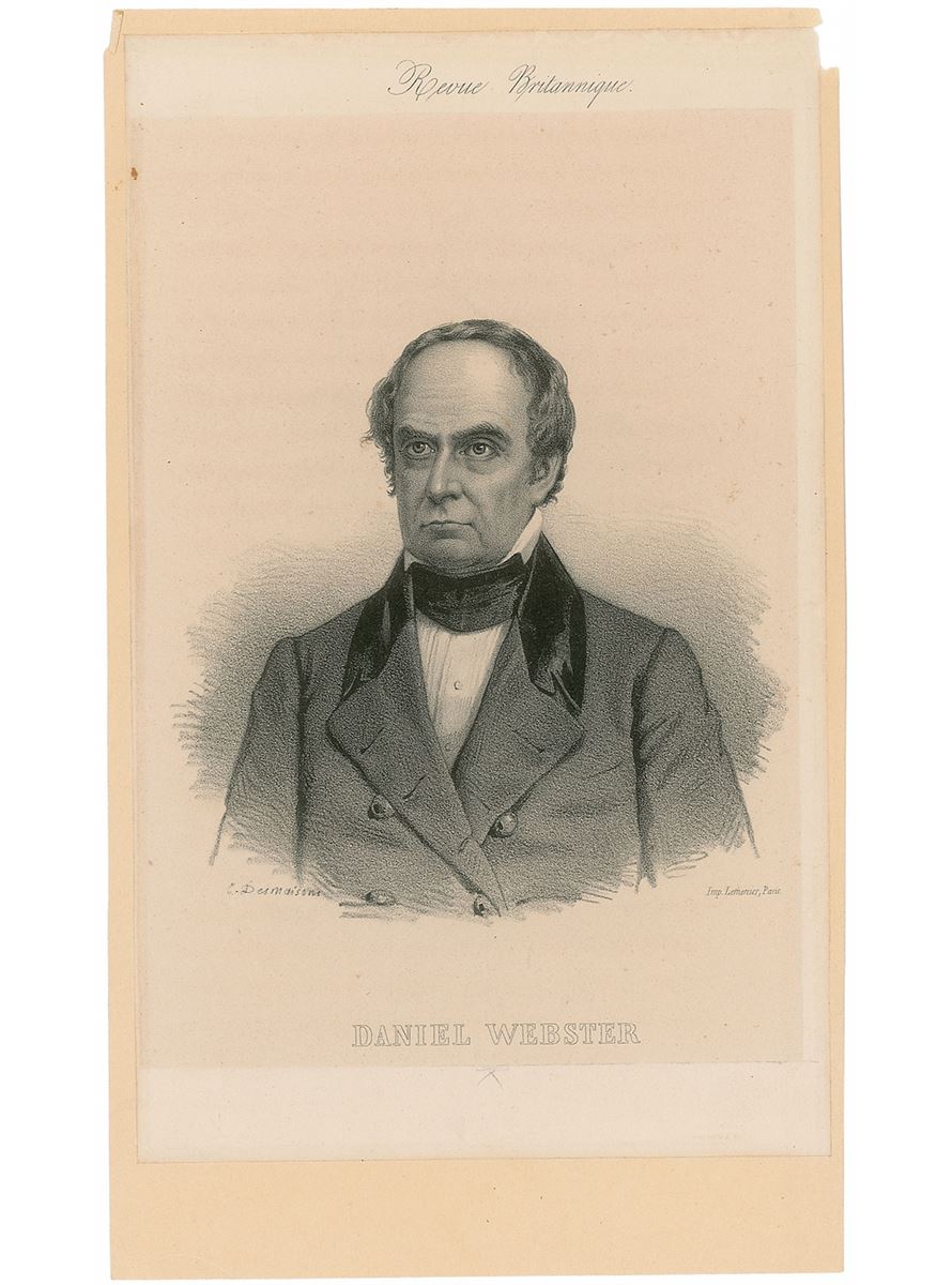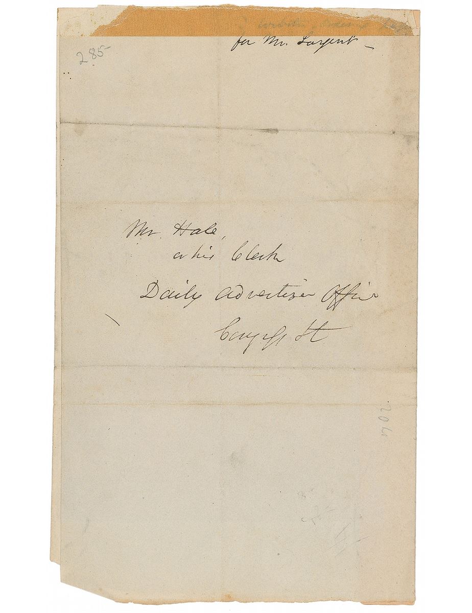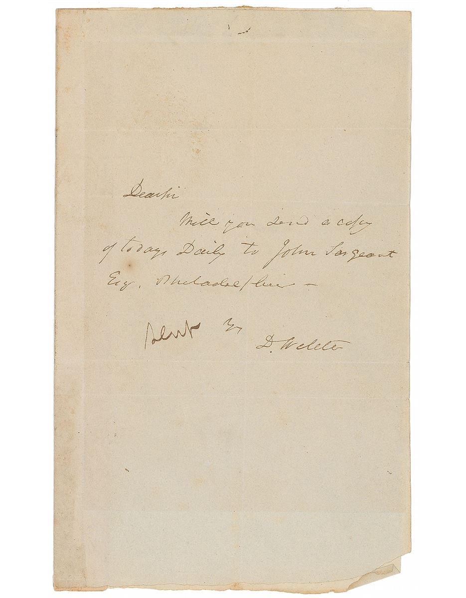 ALS signed “D. Webster,” one page, 4.75 x 8, no date. Letter to Mr. Hale, editor of The Daily Advertiser. In full: “Will you send a copy of today’s Daily to John Sargent Esq. of Philadelphia.” Lower portion bears a notation in another hand, “Sent.” Addressed on the reverse of the second integral page in Webster’s hand. In very good condition, with soiling, show-through from a mounting strip to the left side, and paper loss to the lower right corner. Accompanied by an unsigned engraving.