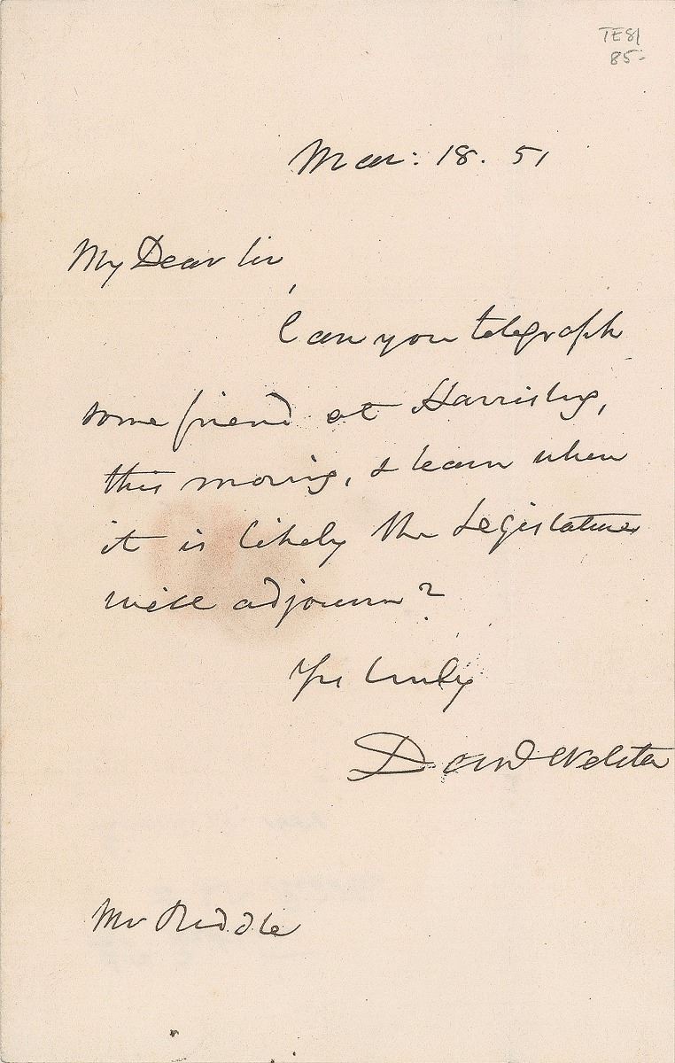 ALS signed “Dan’l Webster,” one page, 4.25 x 7, March 18, 1851. Letter to William S. Riddle, in full: “Can you telegraph some friend at Harrisburg, this morning, & learn when it is likely the legislature will adjourn?” In very good to fine condition, with a light stain to the letter and a tear through the free frank. Accompanied by the original hand-addressed mailing envelope, franked “Dan’l Webster.”