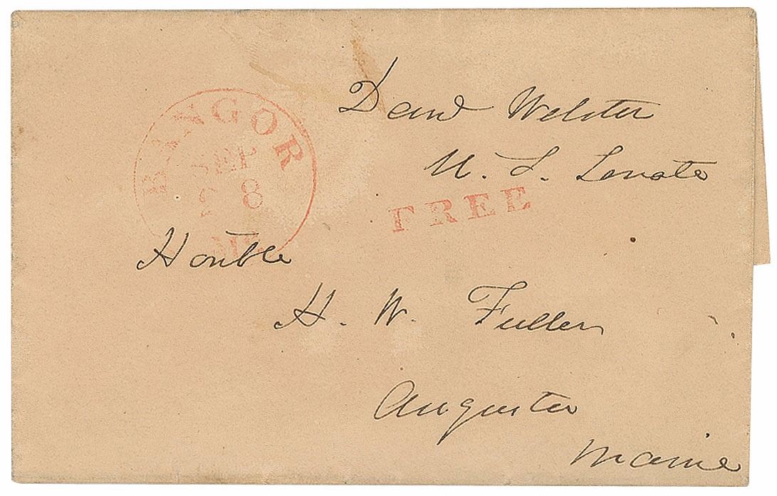 Full free frank, measuring 9.75 x 7.75 with a center panel of 4.75 x 3, addressed in Webster’s hand to “Honble. H. W. Fuller, Augusta, Maine,” and franked in the upper right, “Dan’l Webster, U. S. Senate.” In fine condition, with some light toning. Accompanied by an original engraved portrait and a certificate of authenticity from Goodspeed’s Book Shop.