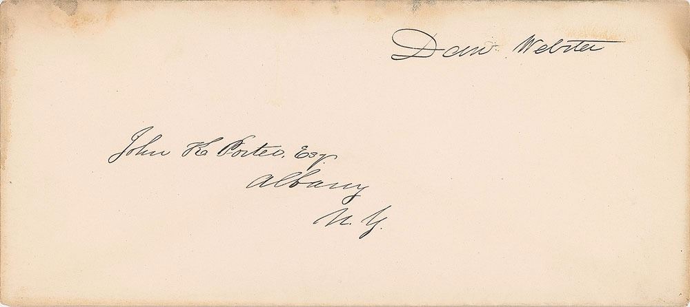 Free franked mailing envelope, 9 x 4, addressed in Webster's hand to "John K. Porter, Esq., Albany, N. Y.," and franked in the upper right, "Dan'l Webster." In fine condition, with light edge staining.
