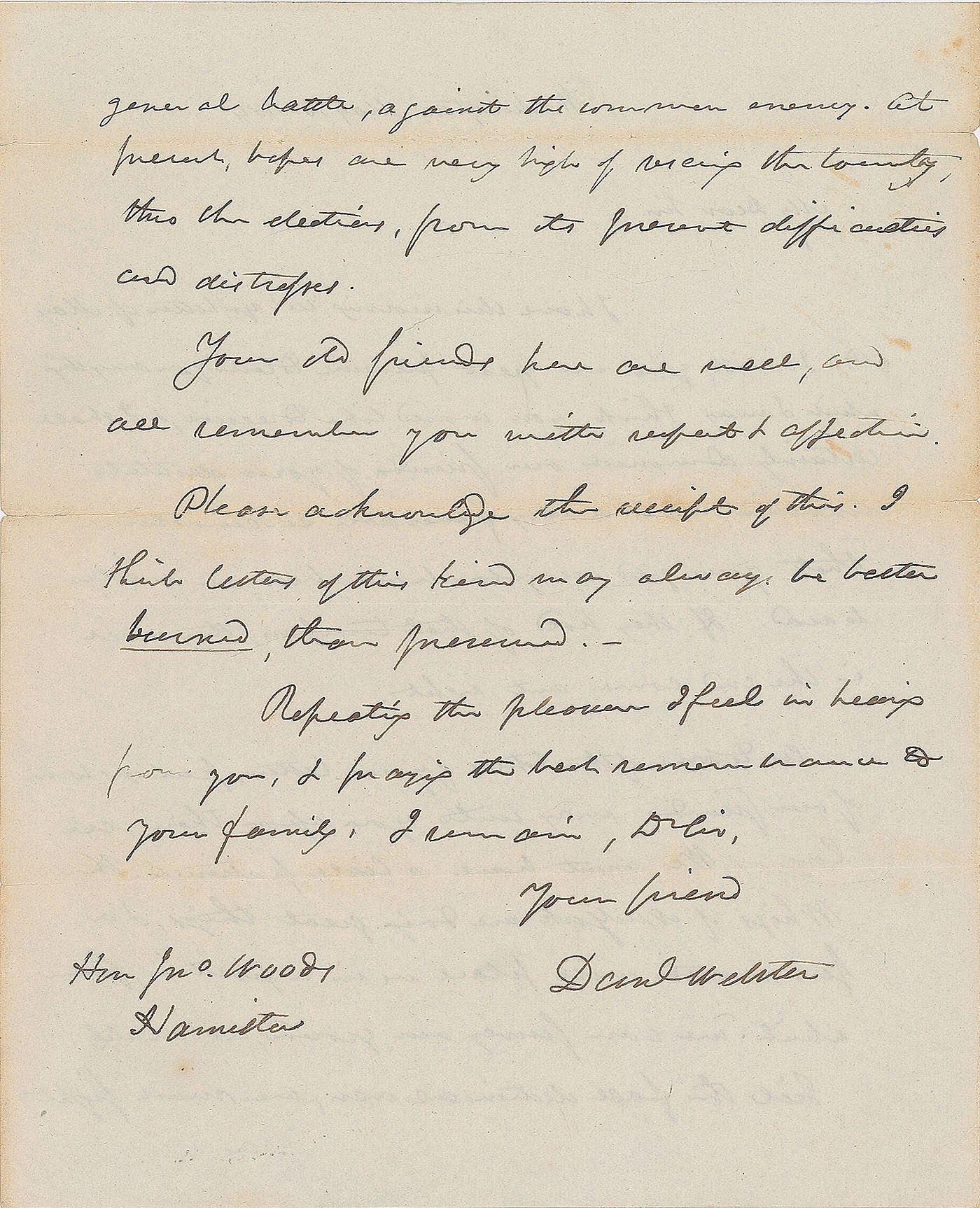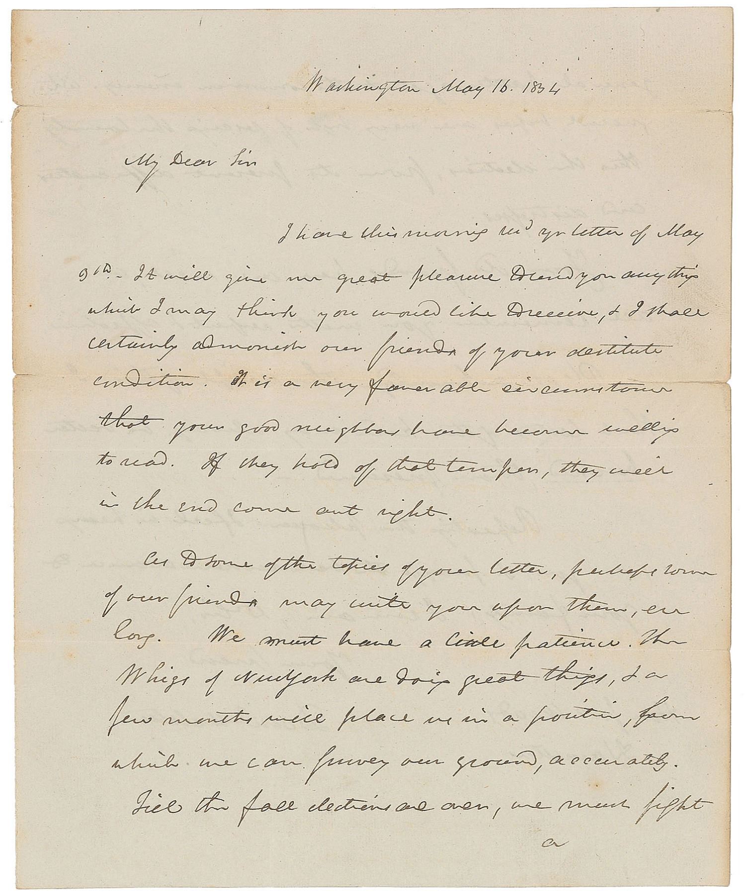 ALS signed “Danl Webster,” one page both sides, 7.75 x 9.5, May 16, 1834. Letter to John Woods, the Whig editor and publisher of the Hamilton Intelligencer, in full: "I have this morning rc'd yr letter of May 9th. It will give me great pleasure to send you anything which I may think you would like to receive, & I shall certainly admonish our friends of your destitute condition. It is a very favorable circumstance that your good neighbors have become willing to read. If they hold of that temper, they will in the end come out right. As to some of the topics of your letter, perhaps some of our friends may write you upon them, ere long. We must have a little patience. The Whigs of New York are doing great things, & a few months will place us in a position, from which we can survey our ground, accurately. Till the fall elections are over, we must fight a general battle, against the common enemy. At present, hopes are very high of rescuing the country, thro the elections, from its present difficulties and distresses. Your old friends here are well, and all remember you with respect & affection. Please acknowledge the receipt of this. I think letters of this kind may always be better burned, than preserved. Repeating the pleasure I feel in hearing from you, & praying the best remembrance to your family." In fine condition, with splitting along one fold and along the hinge.