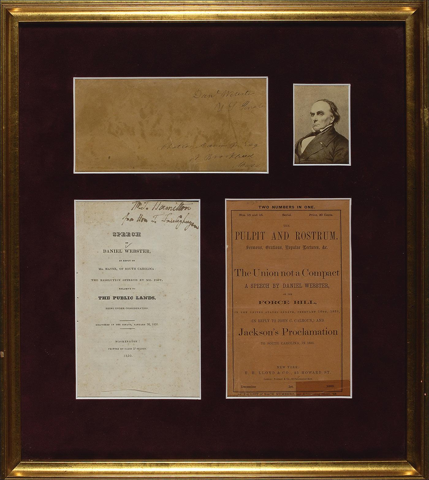 Free-franked address panel, addressed in Webster’s hand to Charles Adams in North Brookfield, Massachusetts, franked in the upper right corner, “Danl Webster, U. S. Senate.” Suede matted and framed with a portrait and two pages from period printings of speeches by Webster, to an overall size of 15.5 x 17.5. In very good condition, with scattered light staining and wrinkling. RRAuction COA.