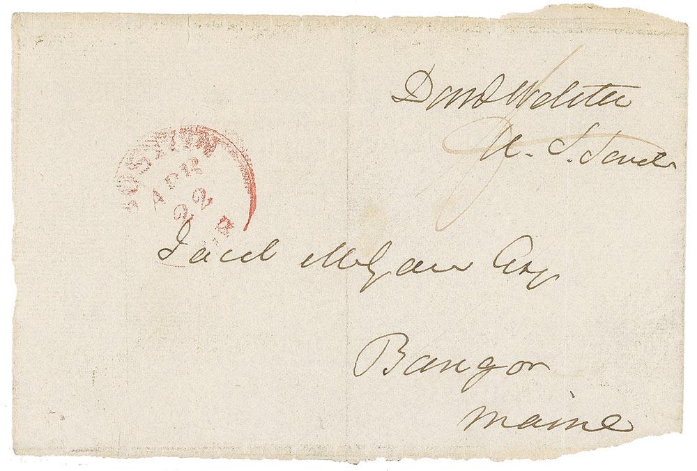 Free franked address panel, 5 x 3.25, addressed in another hand to a resident of Bangor, Maine, and franked in the top right, “Dan’l Webster, U. S. Senate.” In very good condition, with light ink cancellation through franking signature, rough edges, and three vertical folds, one through a single letter of signature. RRAuction COA.