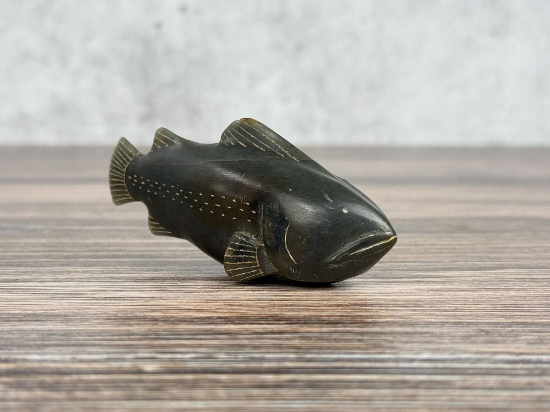 Carved from Soapstone. 3 5/8" by 1 1/2" by 1 1/8". Provenance: Heard Museum, Arizona; Private Collection, New York. Daniel Weetaluktuk (1951-1982) of Inukjuak (east coast of Hudson Bay) made increasingly important contributions to arctic anthropology between 1976 and 1982. His interests in archaeology, traditional Inuit lifeways, cultural resources, and natural history bridged native and scientific perspectives. Daniel participated in government-sponsored excavations in 1976 and 1977, and began investigating northern Quebec archaeological sites thereafter. Working through the Makivik Corporation, he clearly expressed the need of greater Inuit influence in cultural affairs, on the one hand, and of training and science education on the other. His attempts to improve Inuit-southern Canadian relations and awareness stand as a model for our time. (Allen P. McCartney, 1984, Études/Inuit/Studies 8(10):103)
