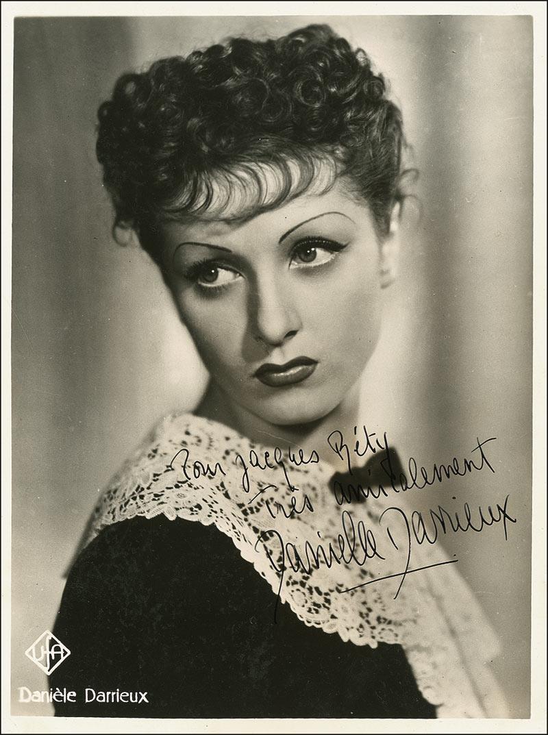 French actress and singer whose eight-decade career is among the longest in film history. Vintage glossy 7 x 9.25 French publicity photo, signed and inscribed in French in black fountain pen. In fine condition with light surface scuffing. Pre-certified PSA/DNA and RRAuction COA.