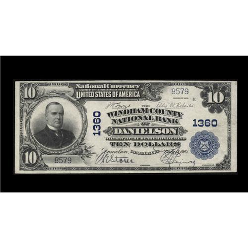 <B>Danielson, CT</B></I> - $10 1902 Plain Back Fr. 624 <B>The Windham County NB</B></I> Ch. # 1360<BR>By far the nicest of the now three $10 Plain Backs recorded from here to date. Bright <B>Very Fine-Extremely Fine.</B></I>