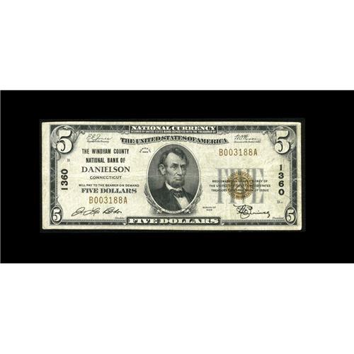 <B>Danielson, CT</B></I> - $5 1929 Ty. 1 <B>The Windham County NB</B></I> Ch. # 1360<BR>This institution issued under three titles, with all its 1929 issue coming under this, the third. Tonight's example is a problem free <B>Very Fine</B></I> with nice margins and considerable remaining crispness.