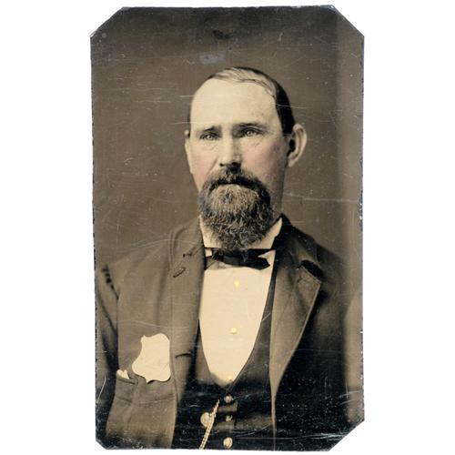 <Our item number 140924><B>[Danielson, General Wilmet] Tintype.</B> Bevel cornered tin plate, no glass or case.4 x 2½ in. Undated tintype of a bearded gentleman wearing vest, gilt buttoned shirt, and coat with officer's badge, reported to be Gen. Wilmet Danielson, but we have been unable to find information on his background or military history. Cheeks with light, handcolored rosy coloring. Fine. <BR>Estimated Value $250 - 350. <BR><BR>Our item number 140924<BR><IMAGES><P ALIGN="CENTER"><IMG SRC="http://www.goldbergcoins.net/liveauction/49jpegs/140924.jpg"> </P></IMAGES>