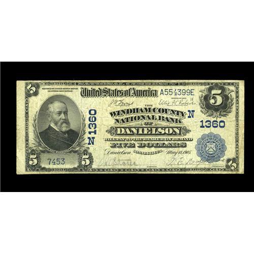<B>Danielson, CT</B></I> - $5 1902 Plain Back Fr. 598 <B>The Windham County NB</B></I> Ch. # (N)1360<BR>One of three large examples from this none too common bank we are privileged to offer tonight. Pleasing <B>Fine.</B></I>