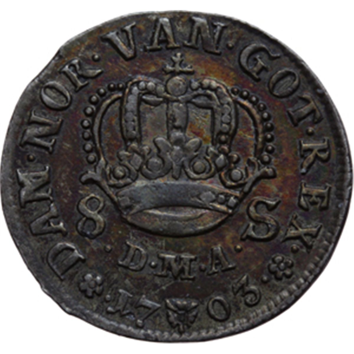 Monete e Medaglie Estere. Danimarca. Federico IV (1699-1730). 8 skilling 1703. KM 470. AG. g. 2.99 SPL.