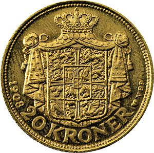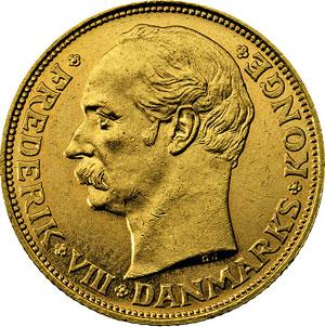 Monete e Medaglie Estere. Danimarca. Federico VIII (1906-1912). 20 corone 1908. Fr. 297. AU. FDC.