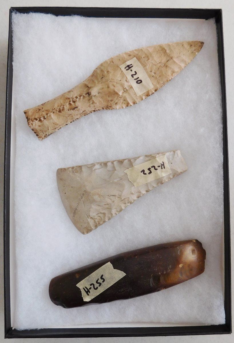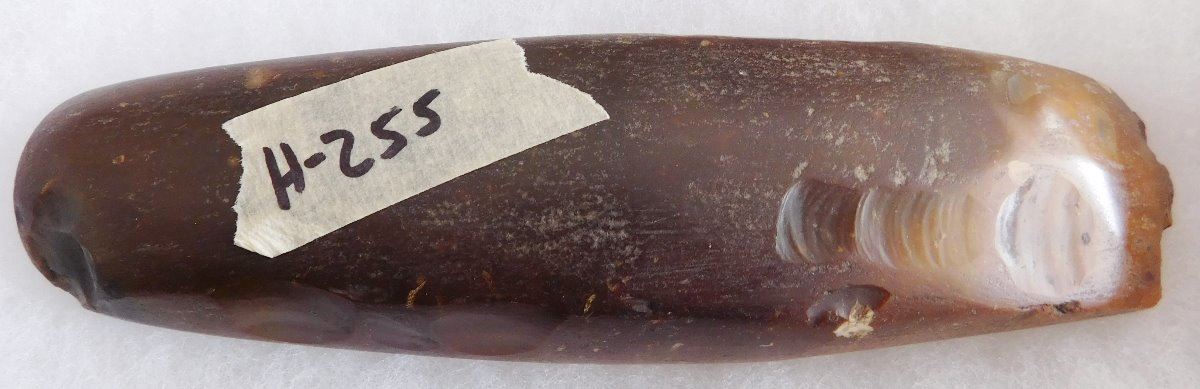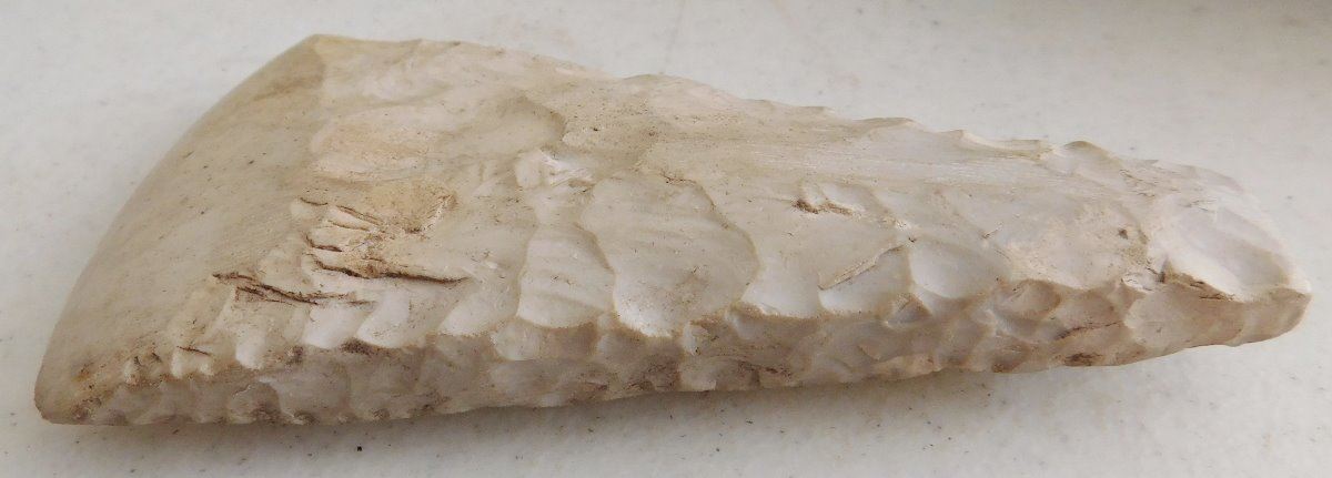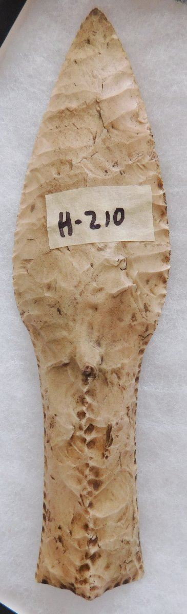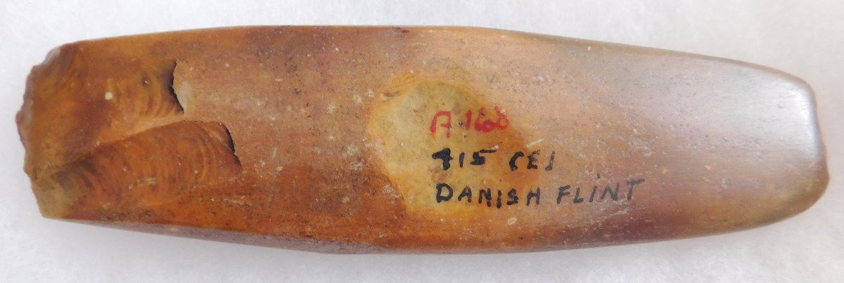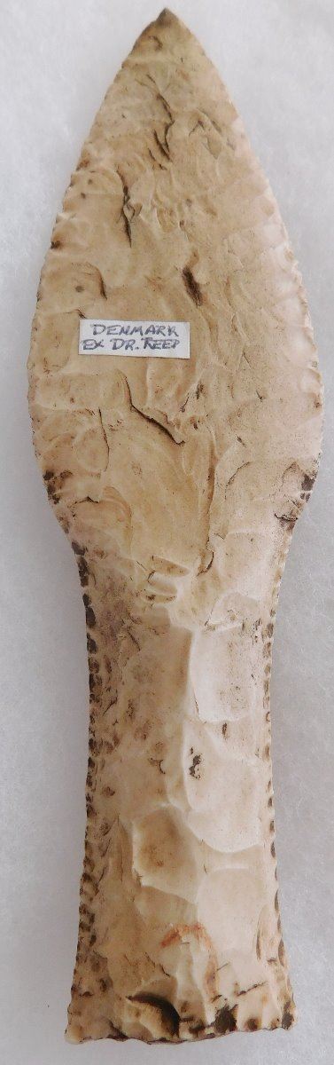 Danish Flint Collection, pre-historic items. Made of chert and flint, the dagger is 7.5" long. Pre-Historic Denmark. Frame not included. Condition: As found, good, see images. Shipping: $30.00 USA estimate only, w/insurance and signature, double-boxed.