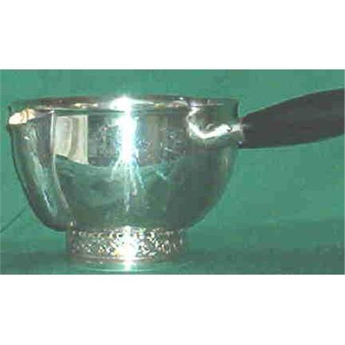 This gravy pourer has an attached outside spout that leads into a hole in the base. This is so that as the gravy "settles" and the grease rises to the top one may pour from the bottom of the server. The other side has a simple "lip" to pour off the grease. Slight cleaning scratches to inside. Pierced cast circular base. Wooden handle held with four silver rivets.Elegant and simple shape.