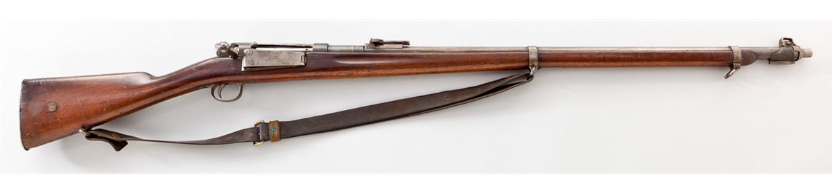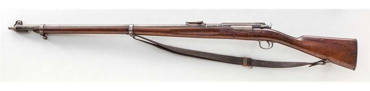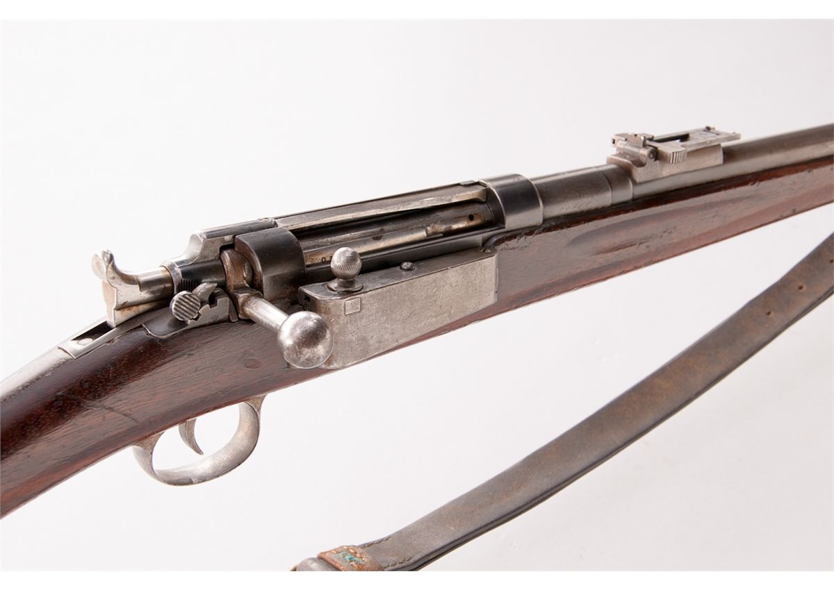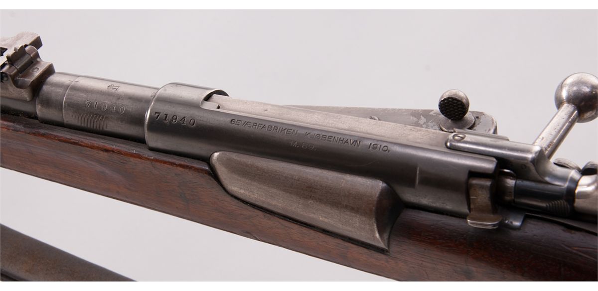 Danish Krag Jorgensen Model 1889 Bolt Action Rifle, #71940, 8x54R cal., 33'' barrel, blue finish, full-length walnut stock, with leather sling and original muzzle cover. During the German occupation in WWII, the Germans re-introduced this rifle for their own use. Side of receiver is marked ''Gevaersabriken Kjorbenhavn 1910./M.89''. Condition is very good retaining approx. 50%-60% original finish with most of the thinning to exposed part of barrel. Rifle appears all matching, with the exception of a different number on bottom of stock which shows light scuffs and loss of definition to the fingergroove. Stock has been cut beneath rear barrel band and is only noticeable on very close examination. The forward portion appears to be original to the rest of the wood. Action is crisp, bore is fair. Est.: $500-$750. (C&R)