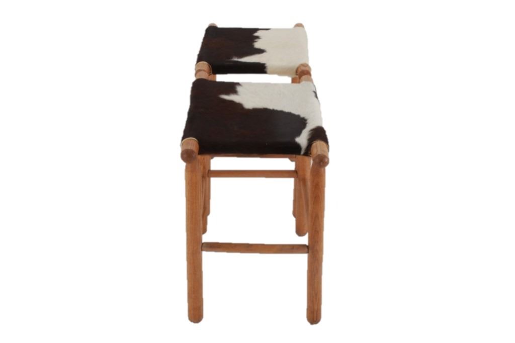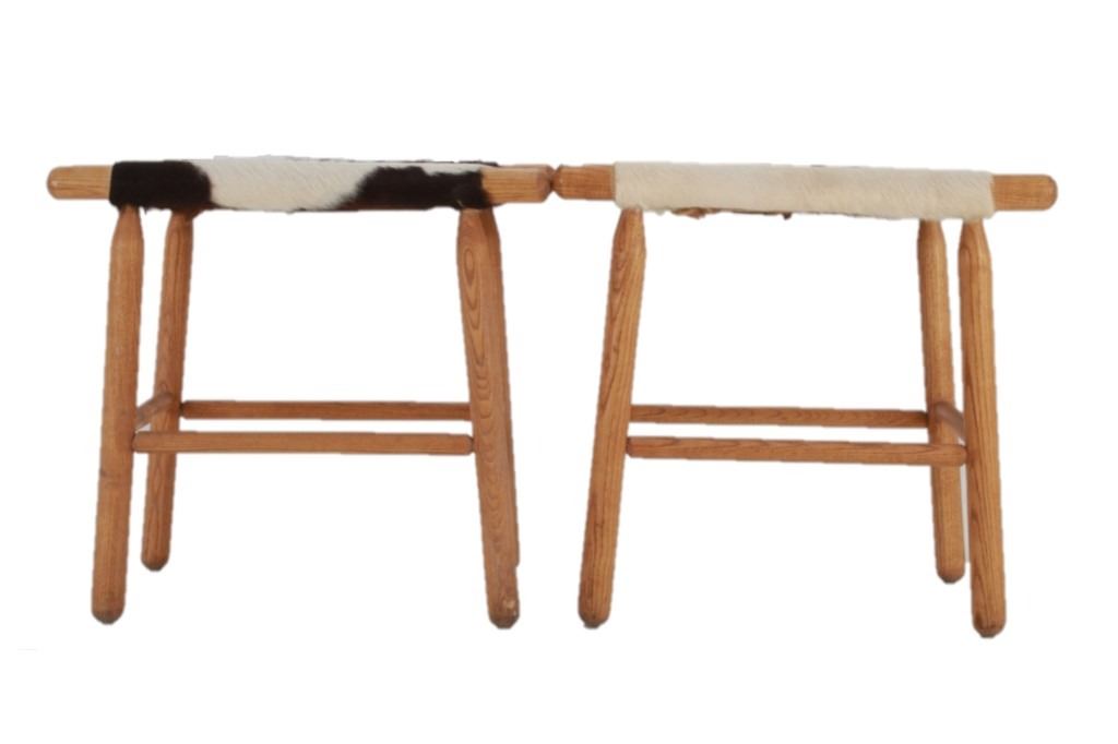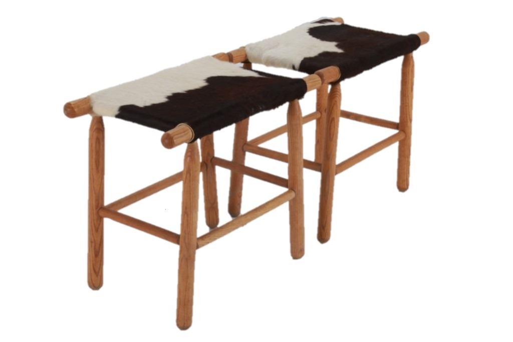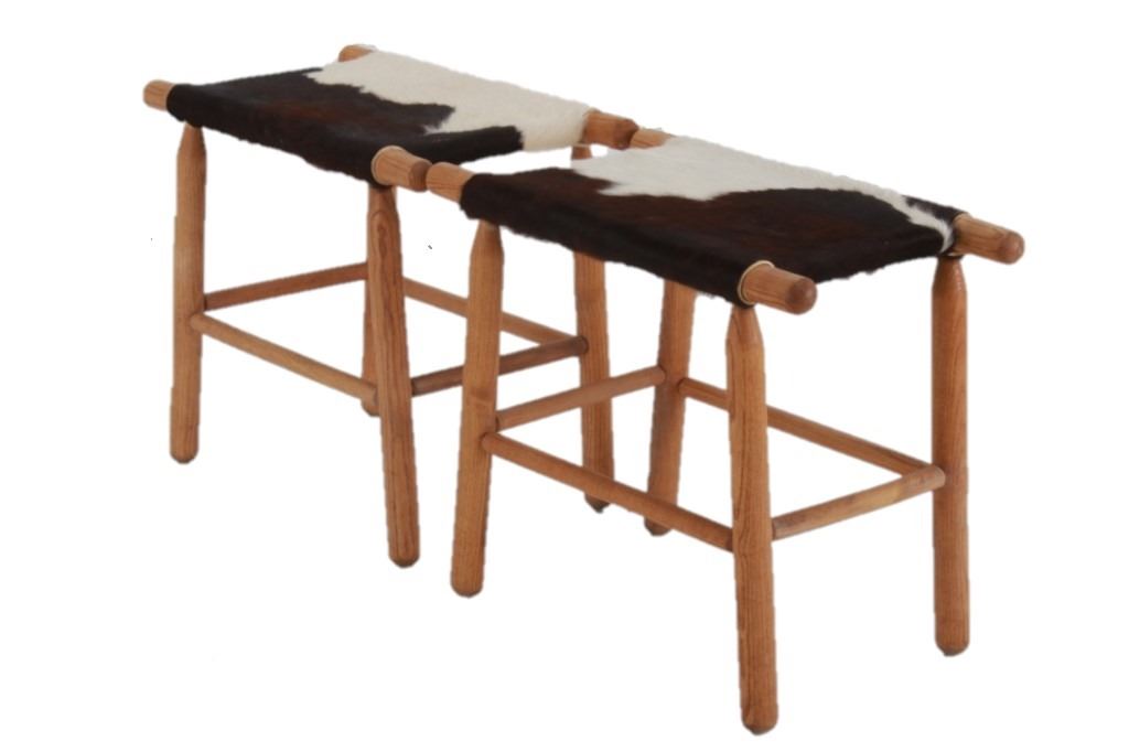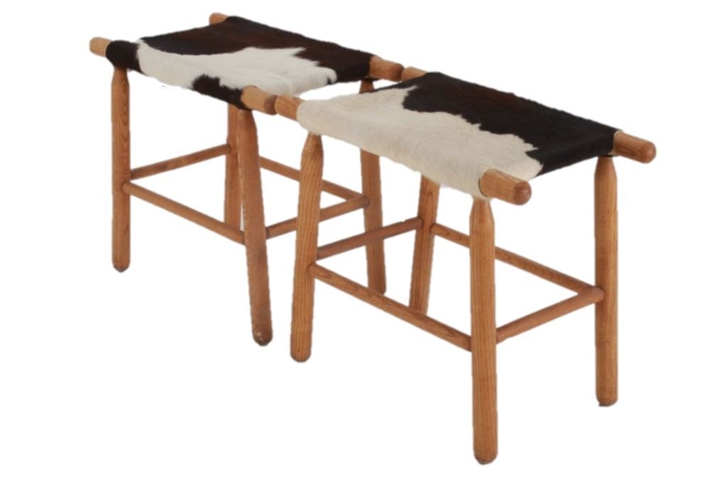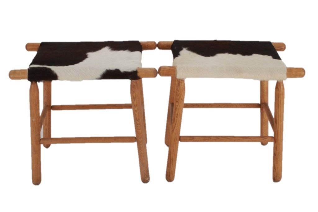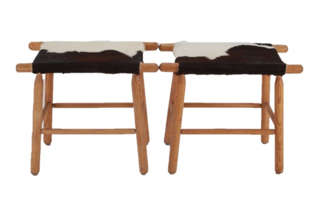 This is an outstanding Danish Mid-Century Modern wood and cowhide stool set from a Montana Dude Ranch estate collection. The set was purchased in Jackson Hole, Wyoming in the 1990’s and features a fantastic Danish Mid-Century Modern wood styled frame with cowhide wrapped upholstered top in a fashionable Holstein black and white coloring. The stool frame protrudes past the ends on each side and has a turned finish with stretched seat, commonly seen on Danish Mid-Century Modern MCM furniture. The condition of this pair of stools is good with no obvious signs of damage and in good overall condition. The measurements of this pair of stools are 22 1/2" x 19 1/2" x 13 1/4".