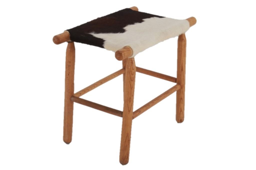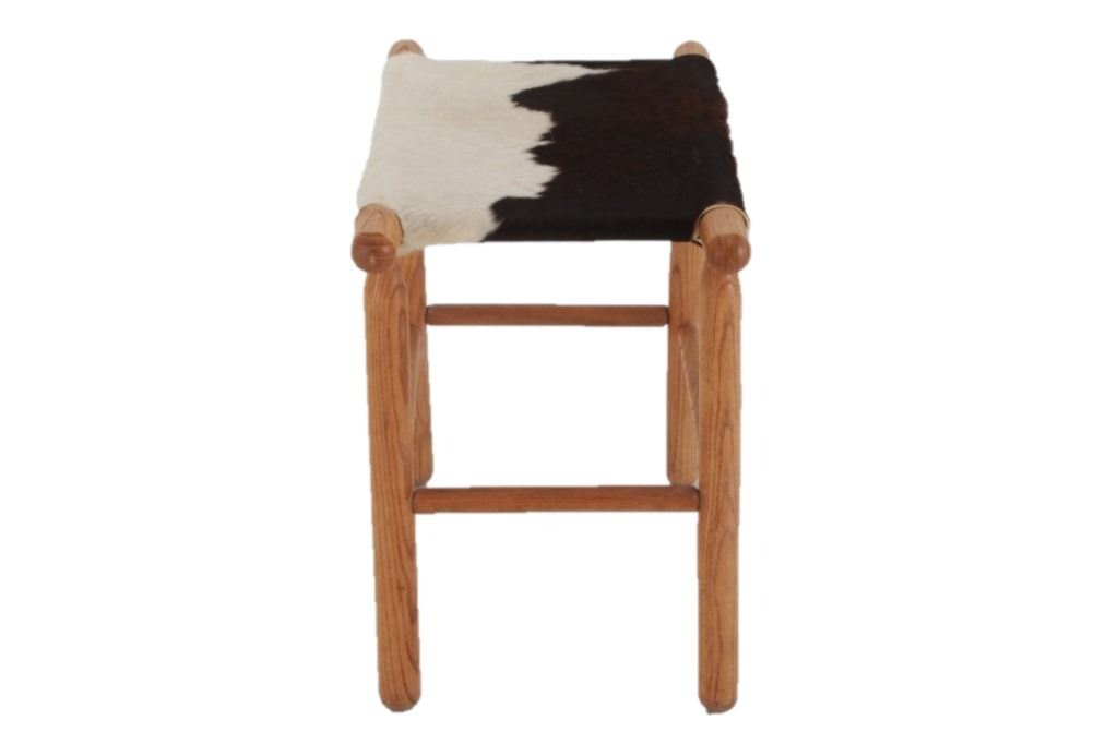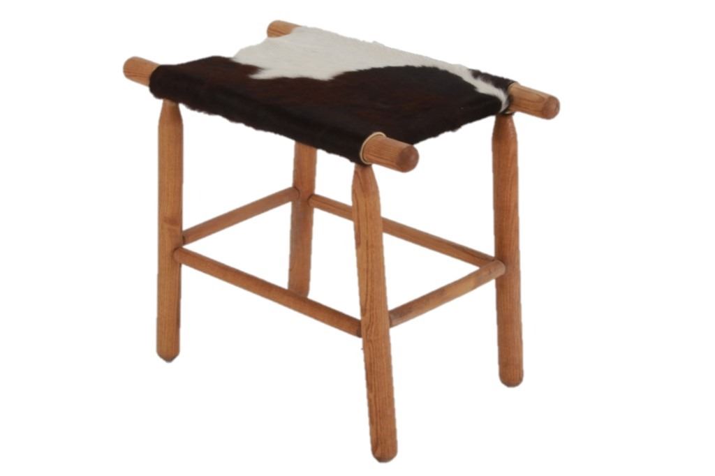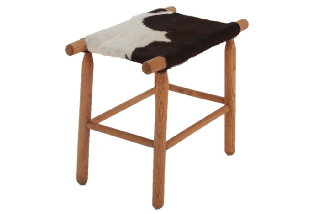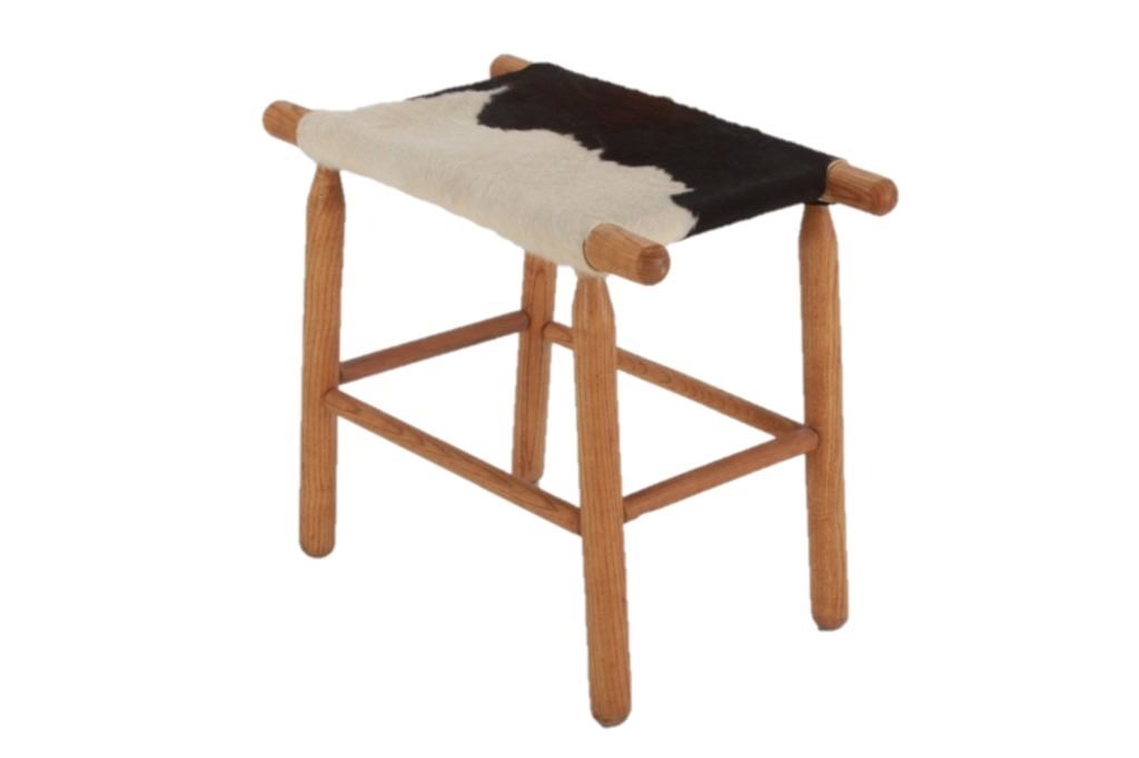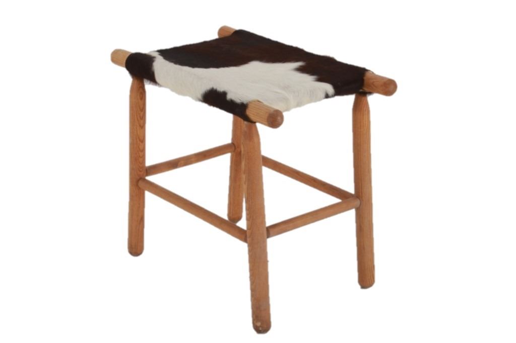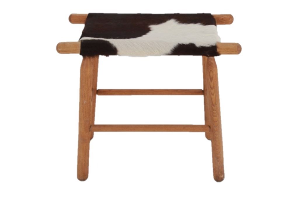 This is an outstanding Danish Mid-Century Modern wood and cowhide stool set from a Montana Dude Ranch estate collection. The set was purchased in Jackson Hole, Wyoming in the 1990’s and features a fantastic Danish Mid-Century Modern wood styled frame with cowhide wrapped upholstered top in a fashionable Holstein black and white coloring. The stool frame protrudes past the ends on each side and has a turned finish with stretched seat, commonly seen on Danish Mid-Century Modern MCM furniture. The condition of this pair of stools is good with no obvious signs of damage and in good overall condition. The measurements of this pair of stools are 22 1/2" x 19 1/2" x 13 1/4".