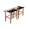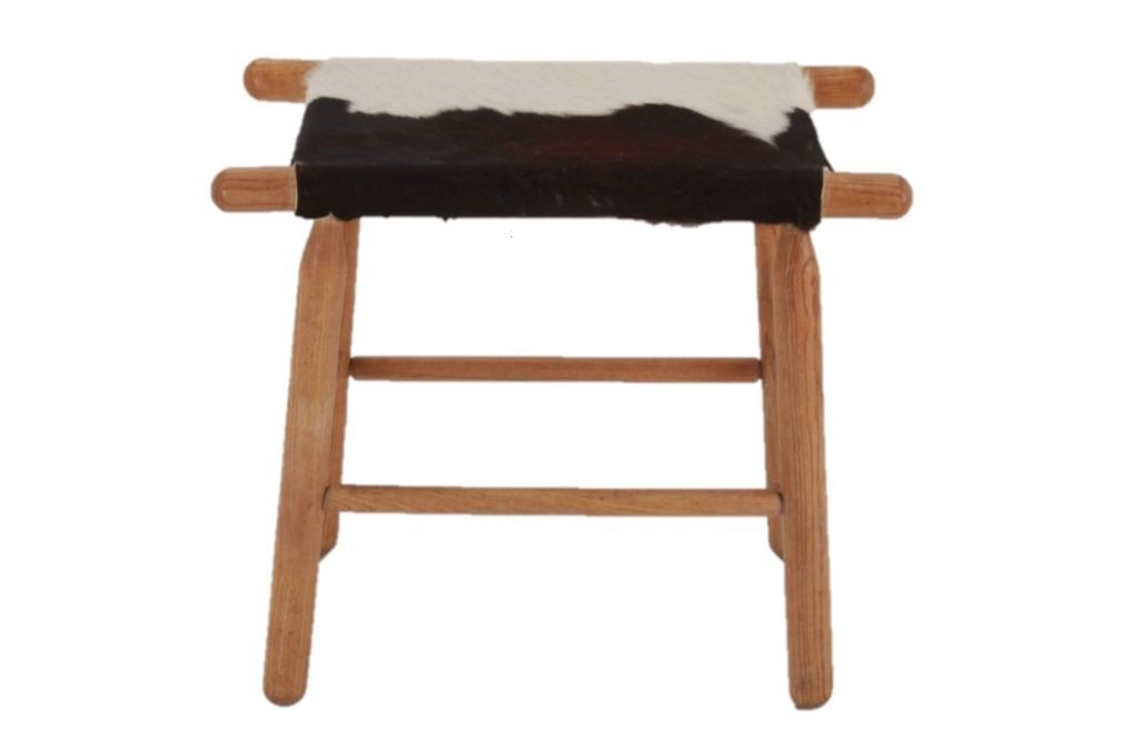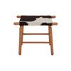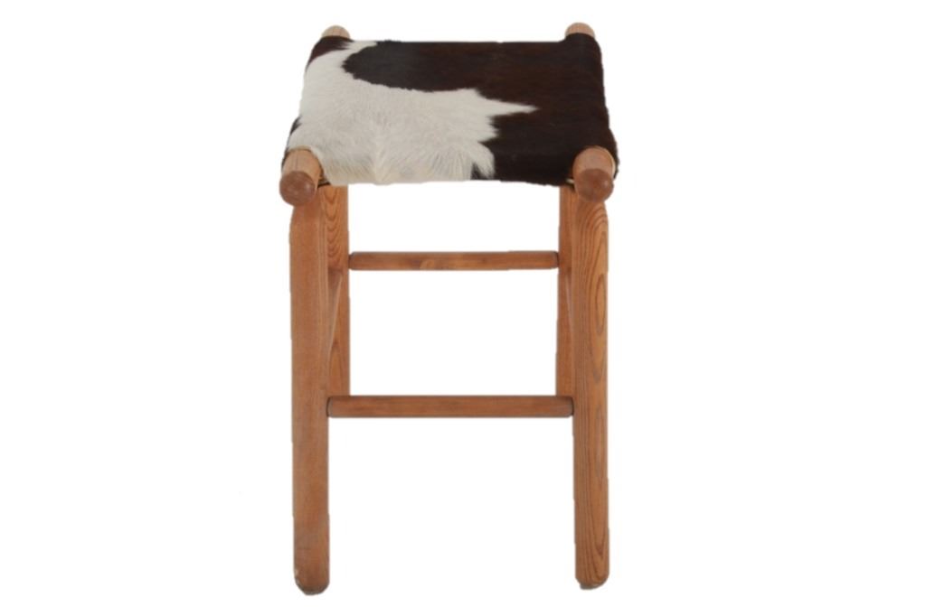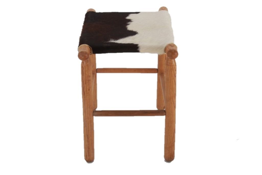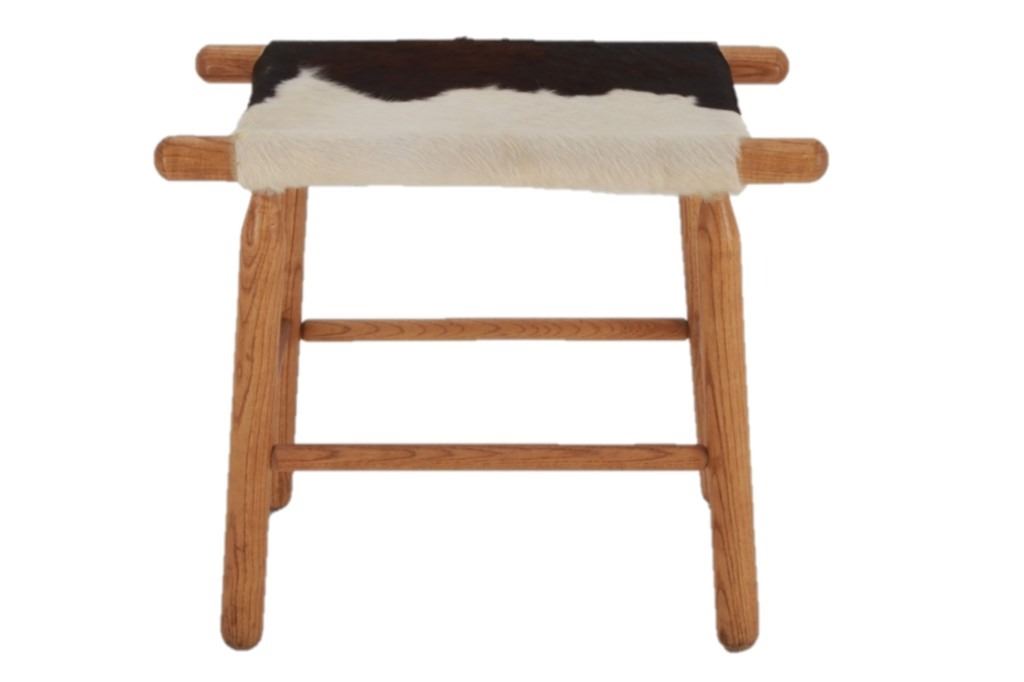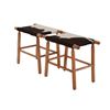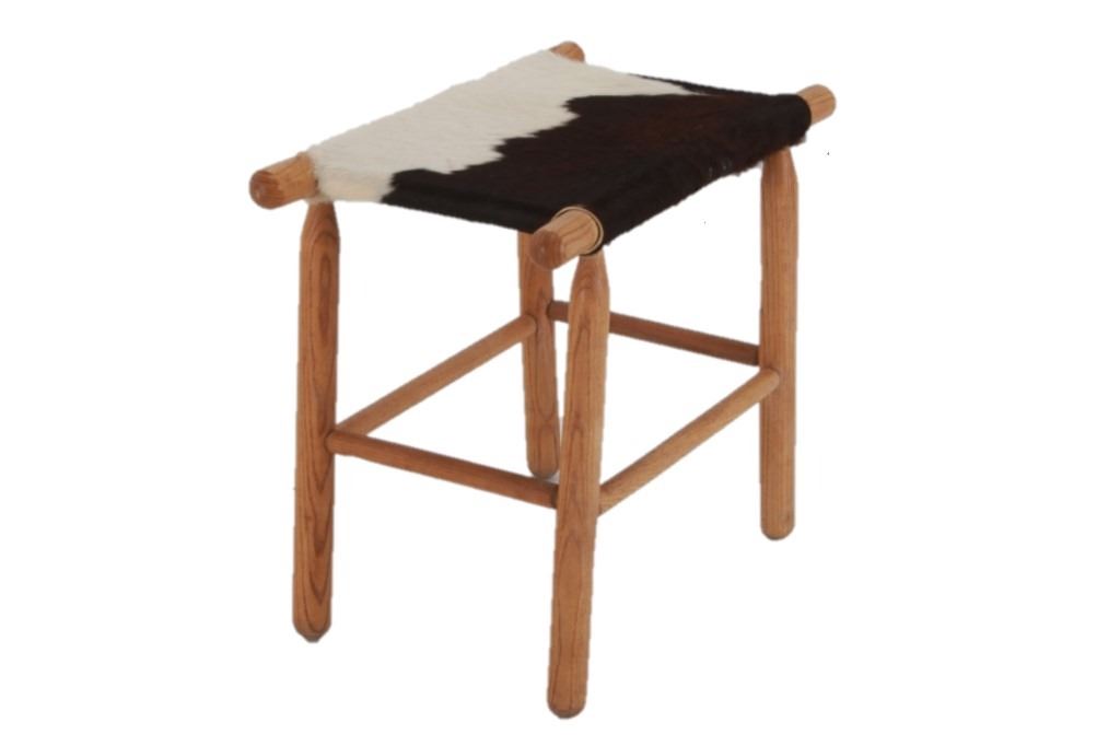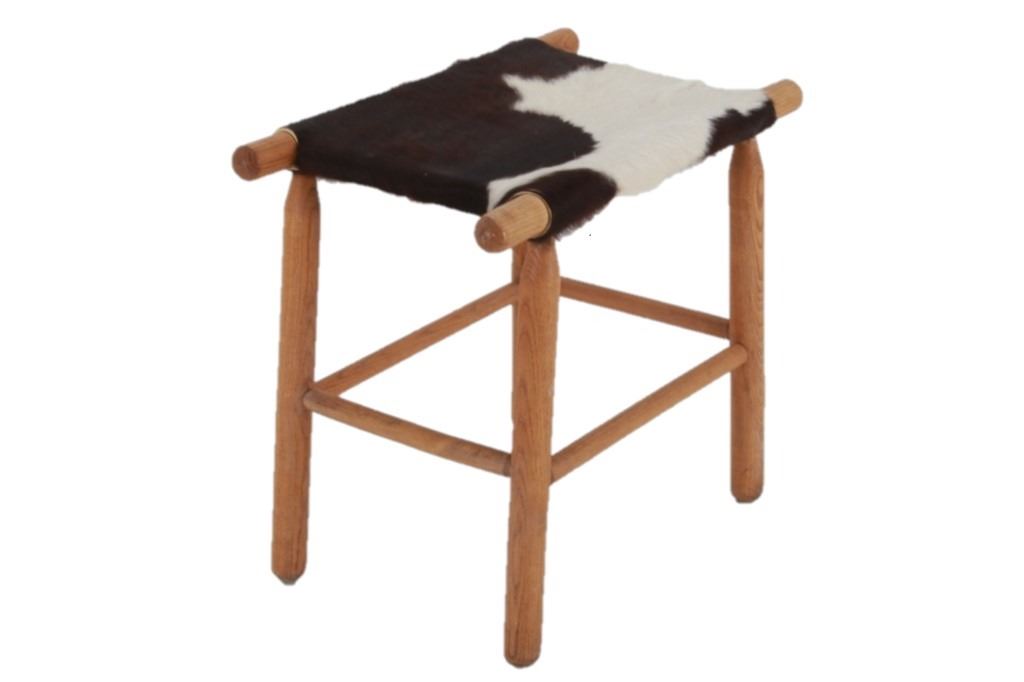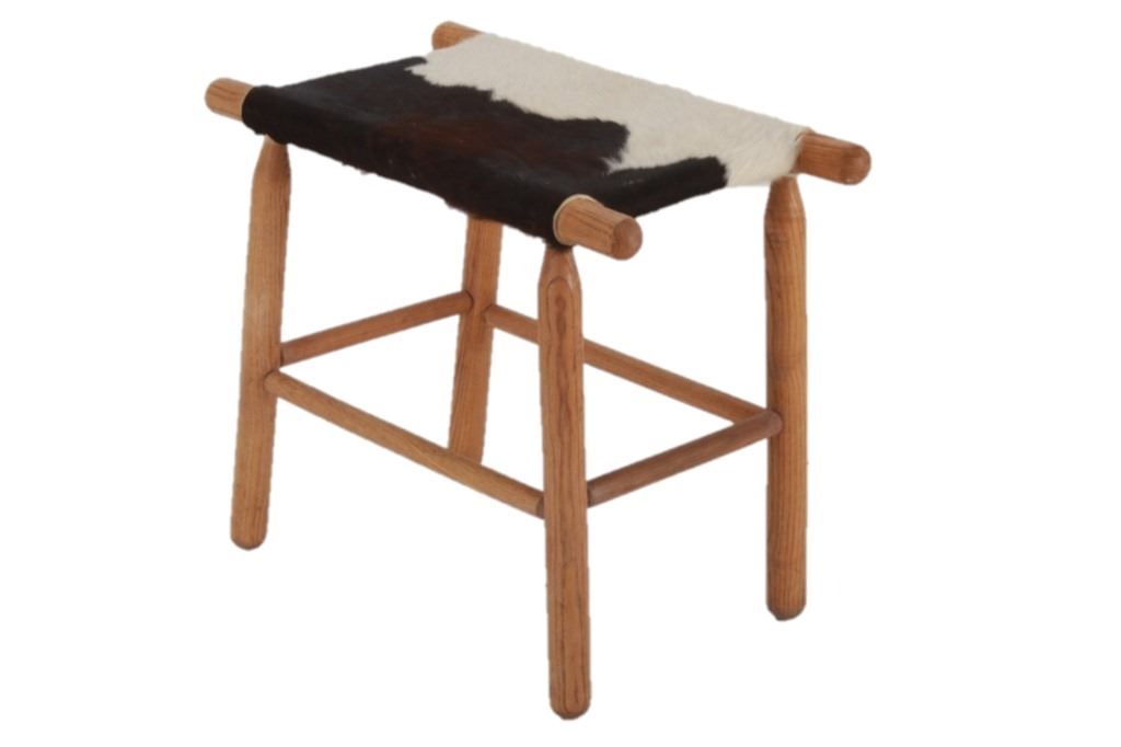 This is an outstanding Danish Mid-Century Modern wood and cowhide stool set from a Montana Dude Ranch estate collection. The set was purchased in Jackson Hole, Wyoming in the 1990’s and features a fantastic Danish Mid-Century Modern wood styled frame with cowhide wrapped upholstered top in a fashionable Holstein black and white coloring. The stool frame protrudes past the ends on each side and has a turned finish with stretched seat, commonly seen on Danish Mid-Century Modern MCM furniture. The condition of this pair of stools is good with no obvious signs of damage and in good overall condition. The measurements of this pair of stools are 22 1/2" x 19 1/2" x 13 1/4".