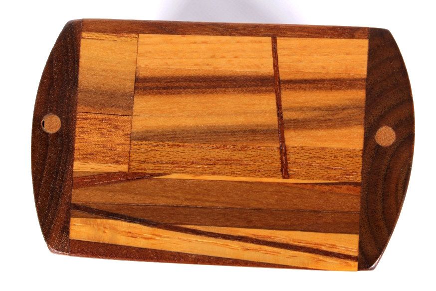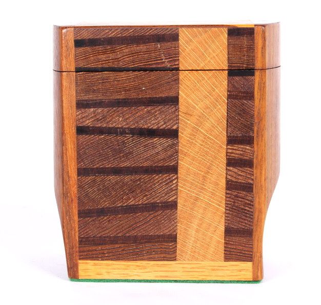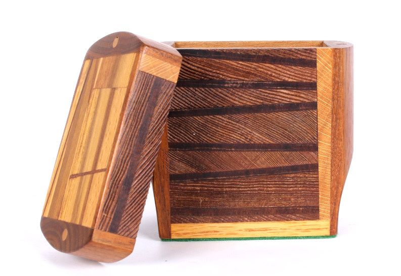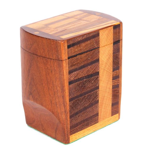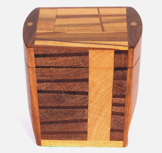 This is a custom hand crafted wood box featuring various different kinds of inlayed and artist designed wood. The box is signed on the inside of the lid. This is a very well made wood box. The box is in excellent condition. The piece measures 4.5" tall and 4"x2.5"