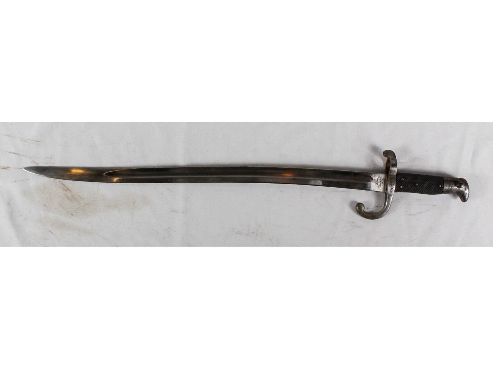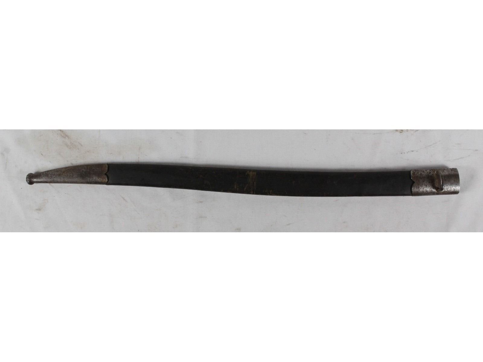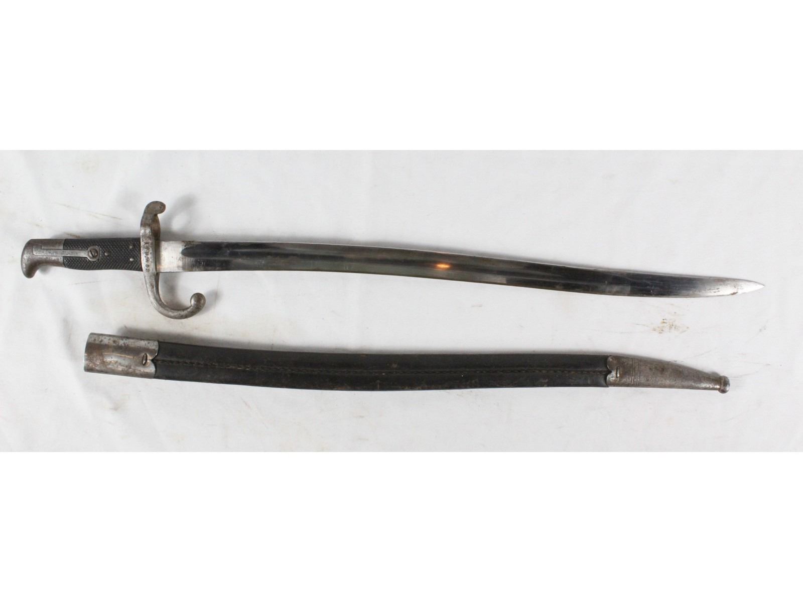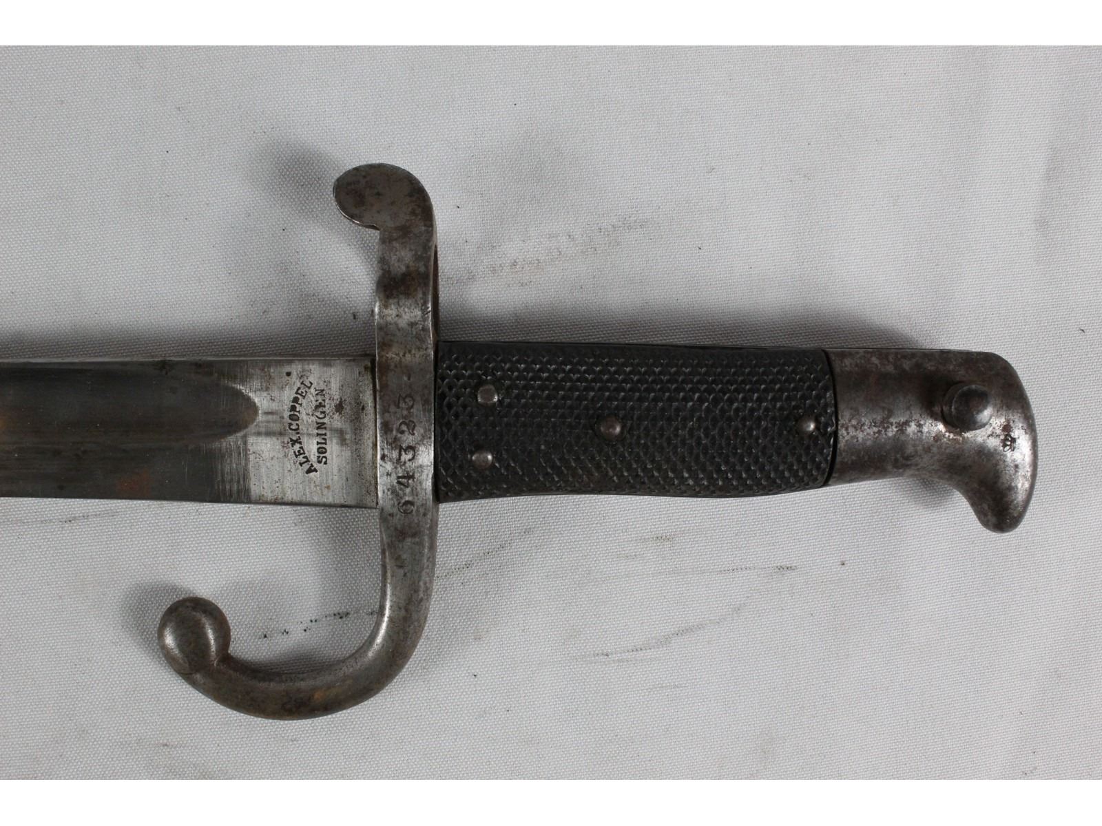 With long exterior spring. Blade measures 22". Bright, sharpened blade. Manufactured by Alex Coppel Solingen. Serial number on crossguard 64323. Faint electric pencil Germany on other side. 17B.852. Scabbard leather is very nice. All metal exhibits slight rust and wear.