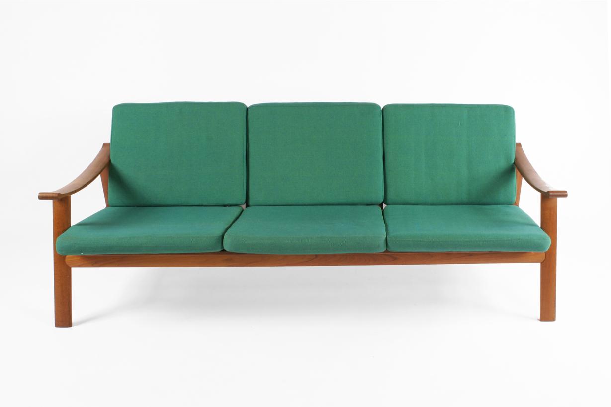 28h x 70w x 27.5d x 15.5h seat inches,solid teak wood and original green fabric, mfg: Bernstorffsminde Möbelfabrik