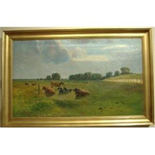 Magnificent oil on canvas by Danish Artist Niels Peter Christiansen 1873-1960. This is a vibrant painting with excellent landscape and animal subject. I get the impression that the artist was traveling down the dirt road and stopped to paint these cows; notice how two of them appear to be looking in the direction where Niels Peter Christiansen would have been painting.