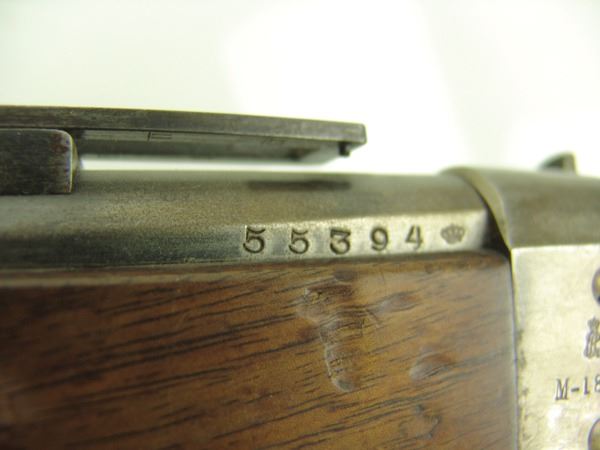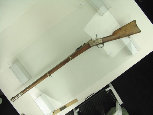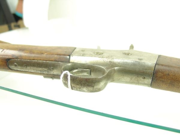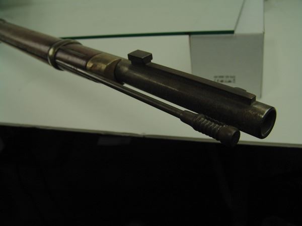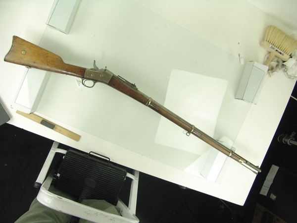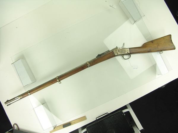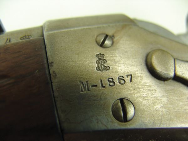 Rare, Kjovenhaven Toihuus model 1867, 11.7mm rolling block, single shot rifle with 35-1/2" barrel, three brass barrel bands, steel cleaning rod, and range finder sight. Very good condition. No S/N. "11.7x42R Danish/Remington cartridge"