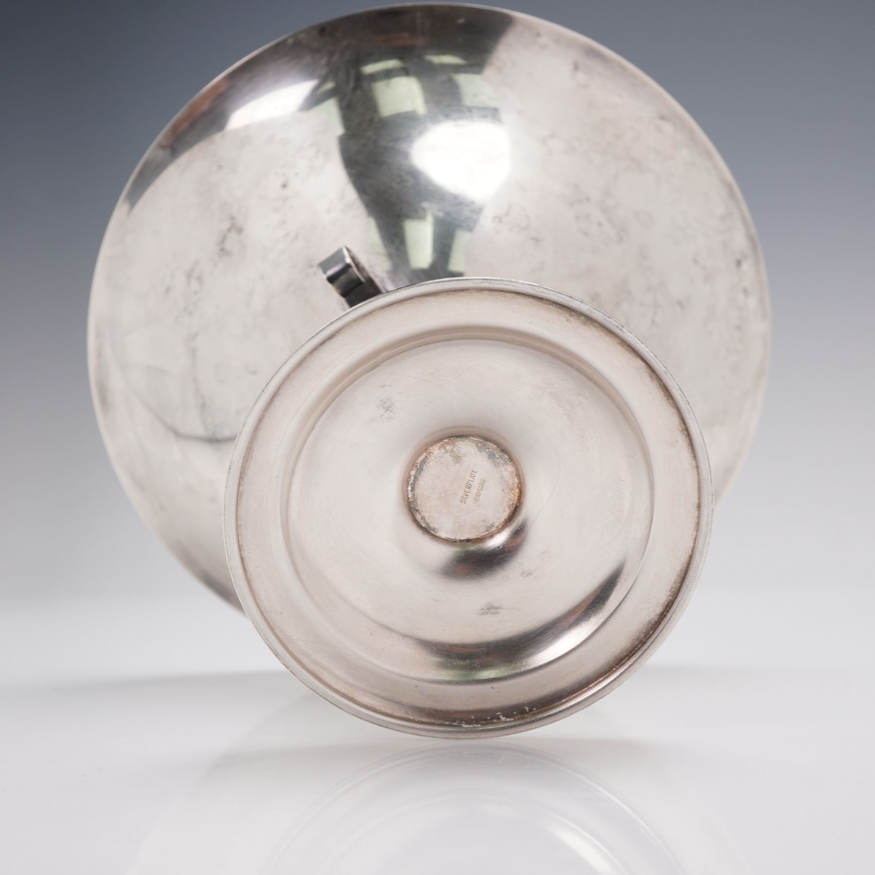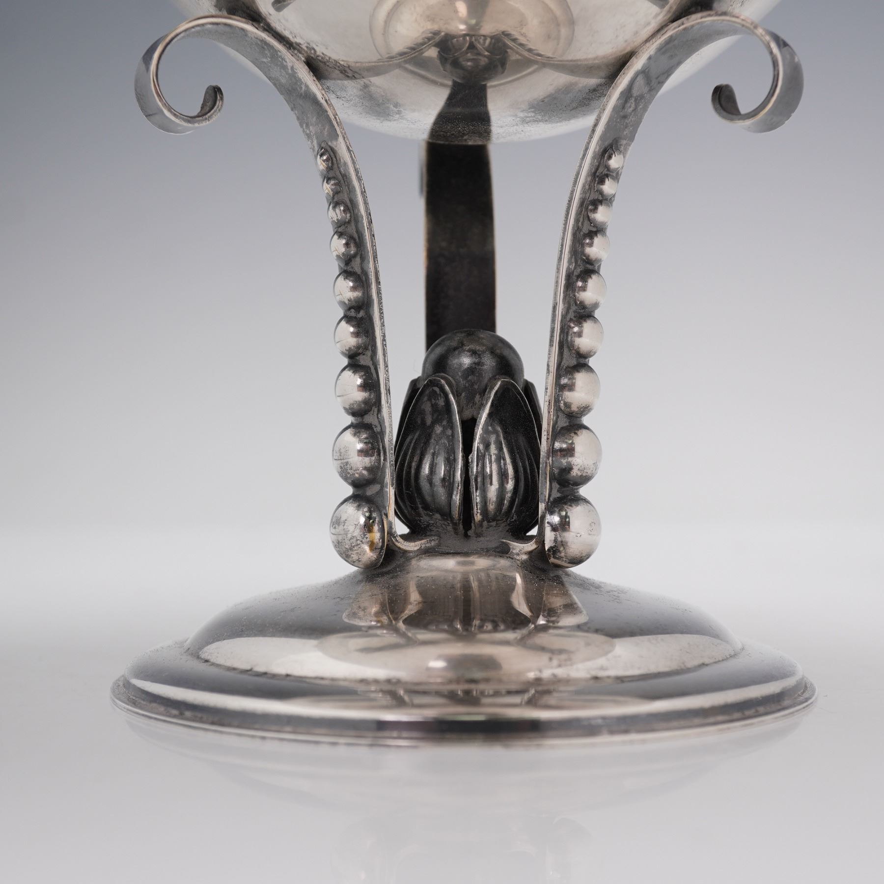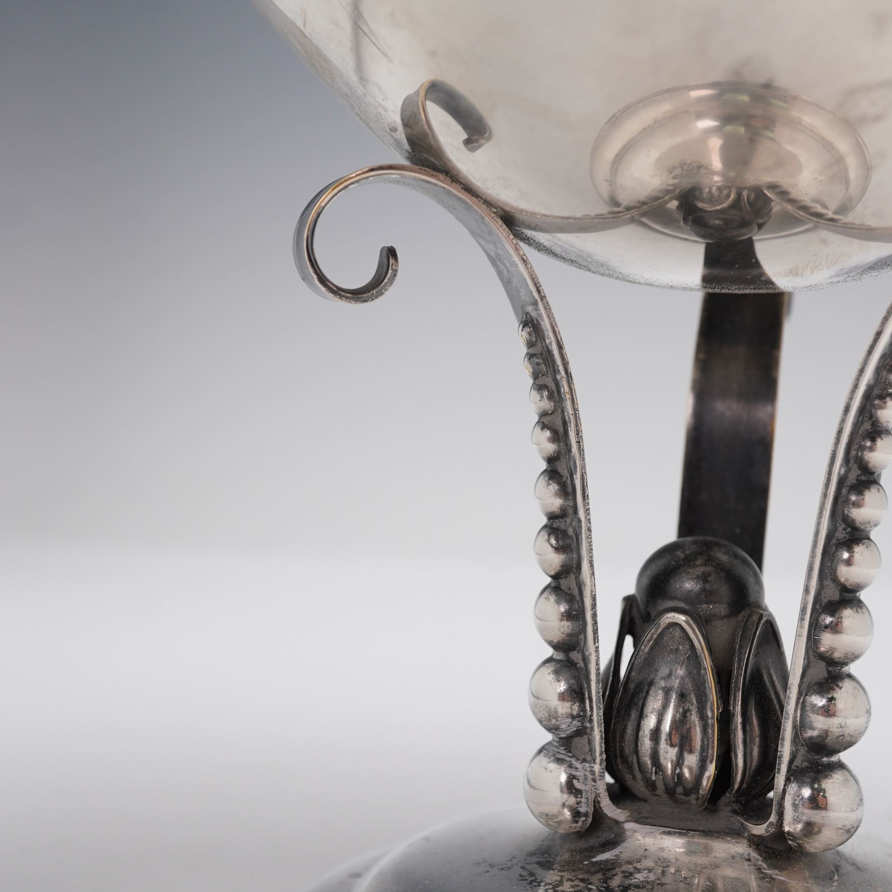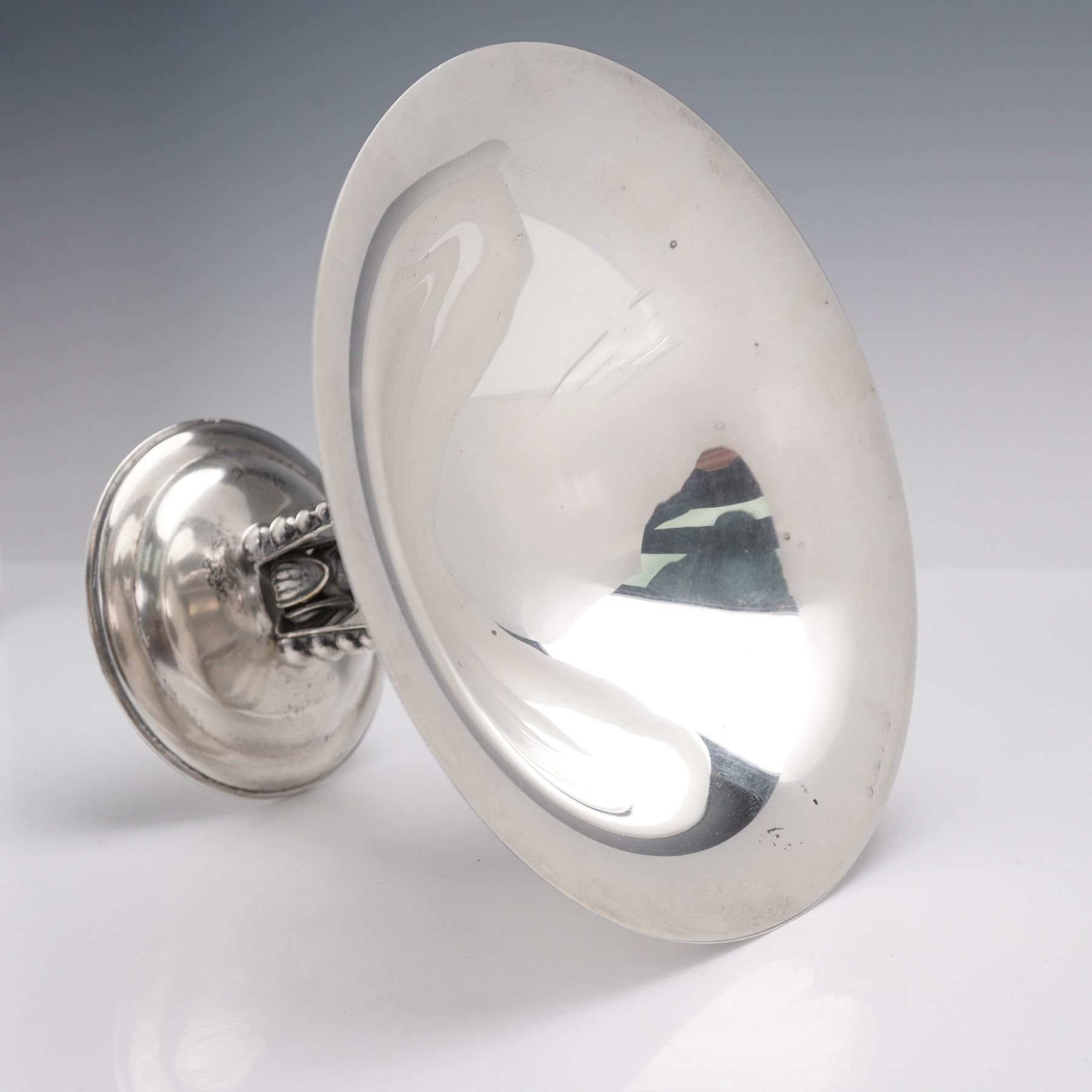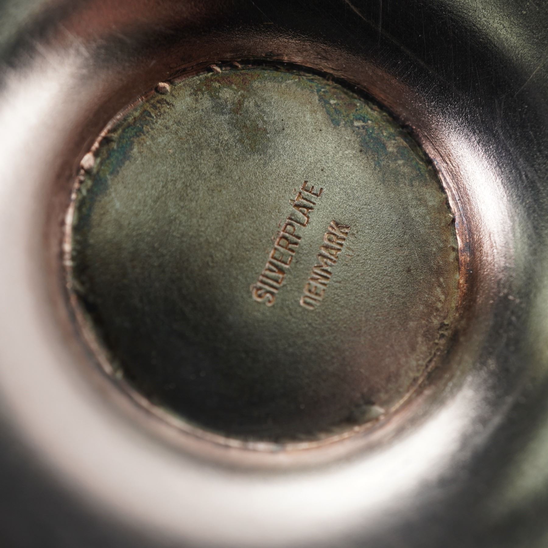Showcasing the elegant artistry of Scandinavian design. The wide flaring bowl rests atop a sculptural stem accented with scrolling supports and a beaded motif, converging at the base with stylized organic details reminiscent of budding forms. Elevated on a circular pedestal foot, the piece embodies the refined balance of functionality and decorative artistry. Marked "Silverplate Denmark" on the underside.
