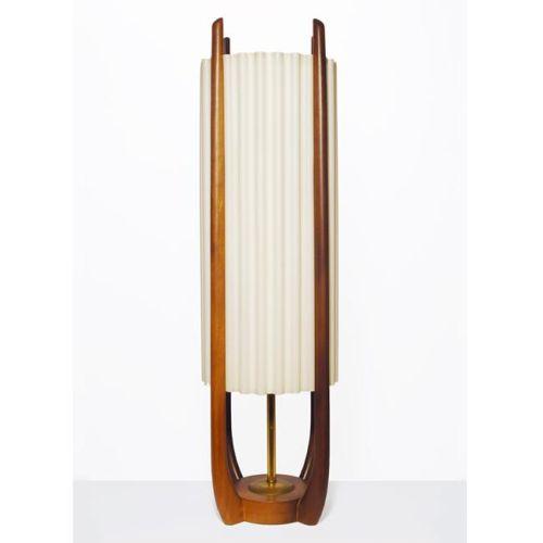 35h x 9.5w x 9.5d inches, solid teak and plastic shade, in original very good condition