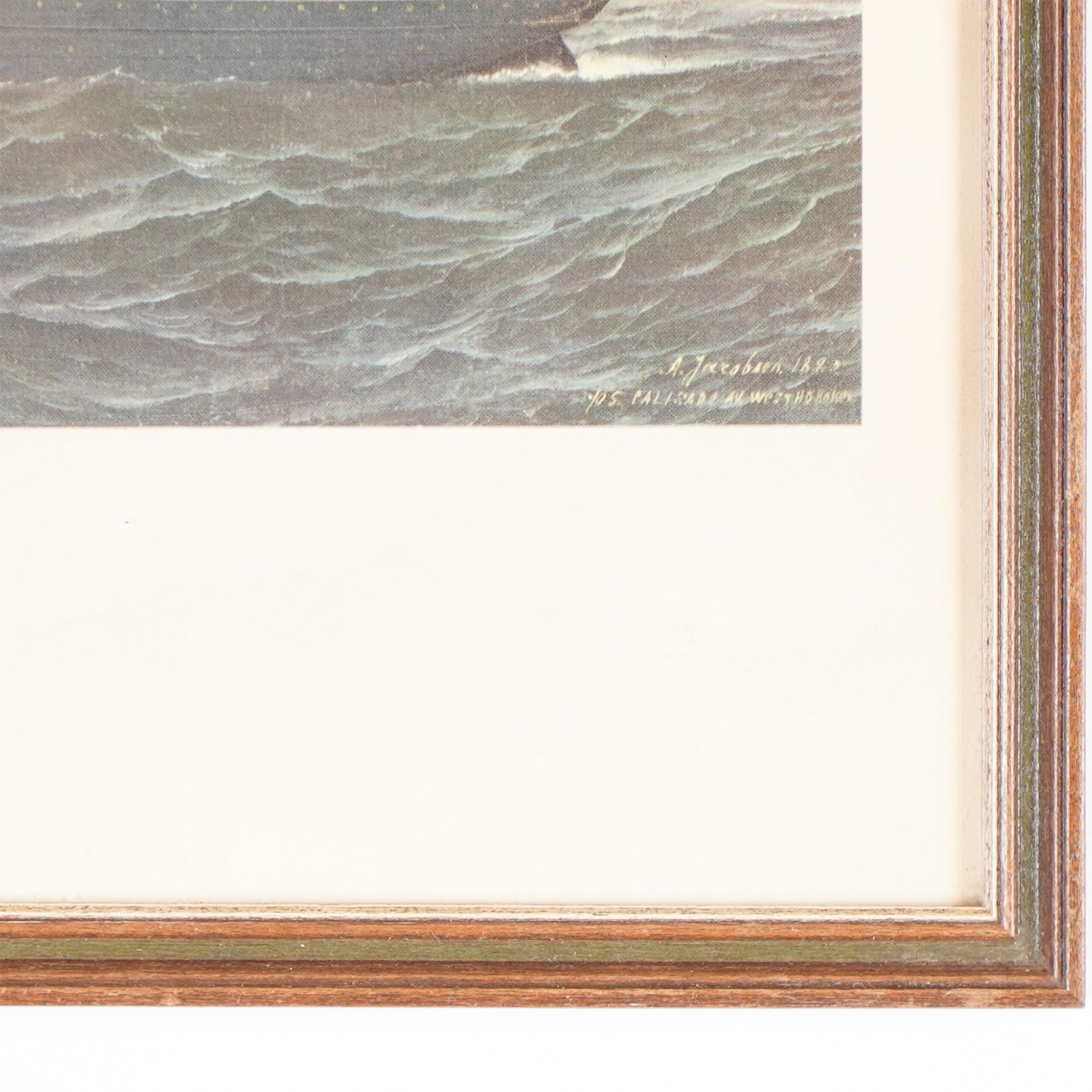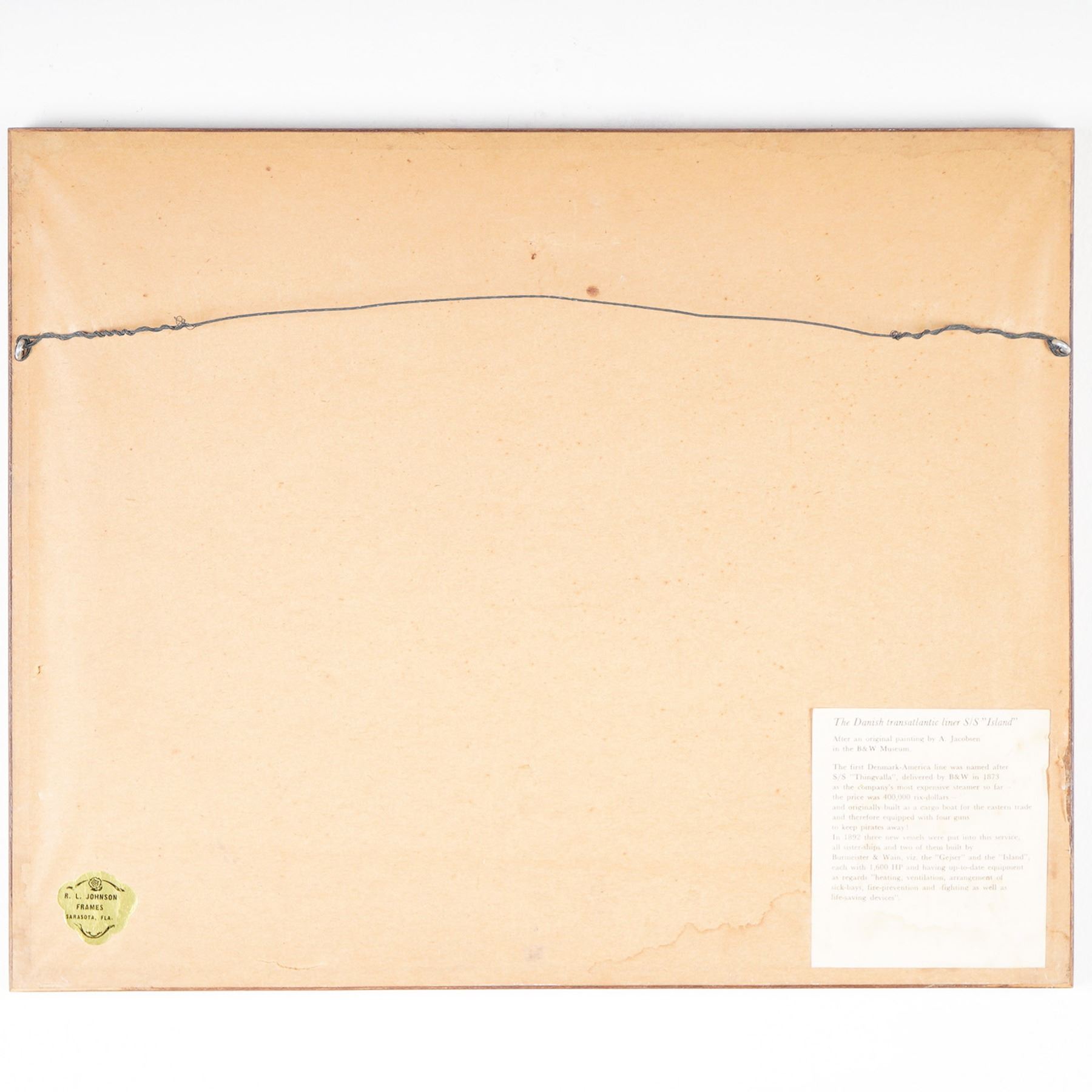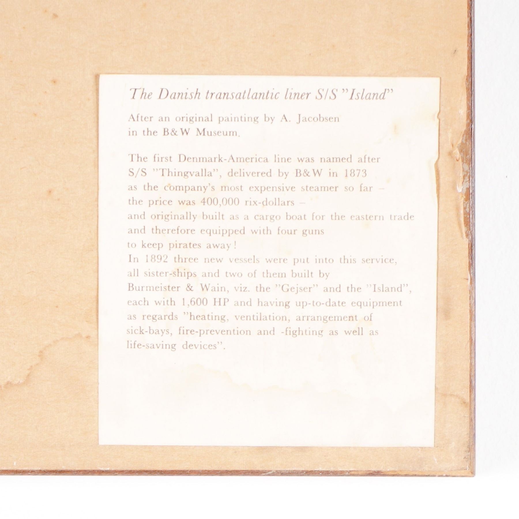 Framed maritime print after an original painting by A. Jacobsen, housed in the B&W Museum. The artwork depicts the Danish transatlantic liner S/S Island, built by Burmeister & Wain in the late 19th century. The ship was part of the Denmark-America line and one of the most advanced vessels of its time, featuring 1,600 HP engines and modern amenities for ventilation, heating, sick bays, fire prevention, and life-saving equipment. A descriptive label affixed to the back provides historical context.