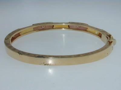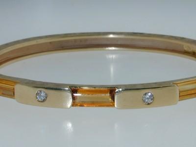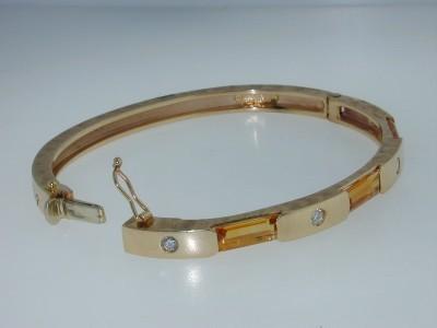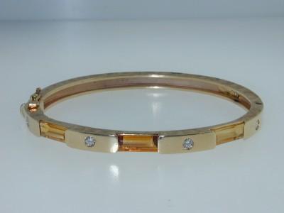 This is a DANKNER 14K Yellow Gold Diamond Citrine Bangle. The total Bangle's weight is 18.4 grams. 4 Round Diamond Weight is 35 pts. approxmiately. G color VVS clarity. Size of Citrine: 9 x5 mm. The measurements of the Bangle are 54 x 43 mm, 5 mm wide and 3 mm thickness.