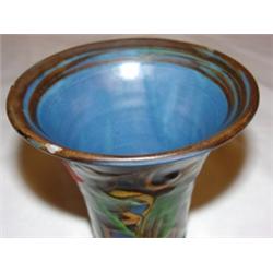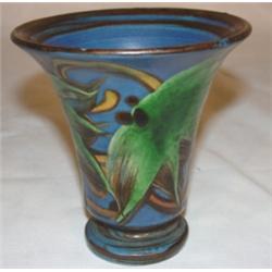 Danmark art pottery vase with leaf design on blue background & 2 minor flakes in outer rim & 1 small flake on bottom. Marked Danmark on bottom. 4 1/2" tall.