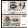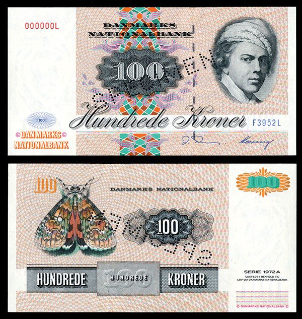 Denmark, 1995, 100 Kroner, P-54c Unlisted Specimen, Black on orange and m/c, Jens Juel's self portrait, S/N 000000L and Pin Punch Specimen, Uncirculated to CU condition, Attractive and rare as specimen.