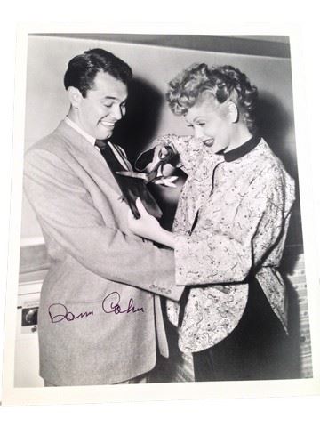 Dann Cahn signed 8"x10" black and white photo with Lucille Ball cutting his tie.