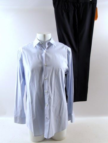 Danny Collins (Al Pacino) screen worn, hero, light blue long sleeve button front 'Banana Republic' dress shirt, (size L) and navy blue flat front pants. Includes wardrobe tag!