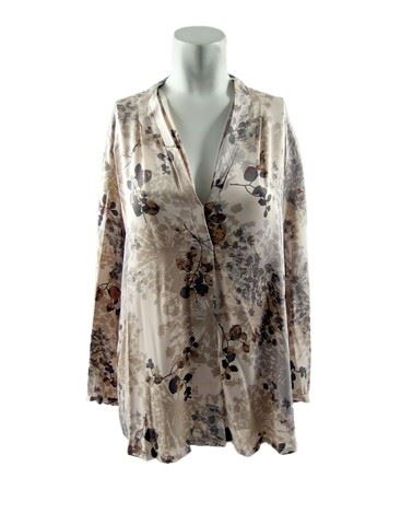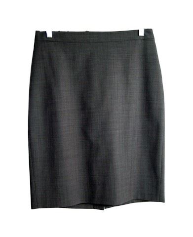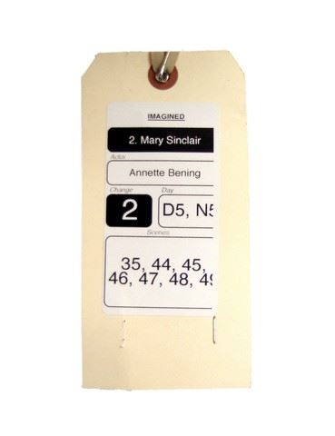 Mary Sinclair (Annette Bening) screen worn, hero, chalky grey two button 'J. Crew' suit jacket and skirt, (size 8 and size 6) and tan, charcoal grey and soft grey layered shadow leaf print long sleeve blouse. Includes wardrobe tag.