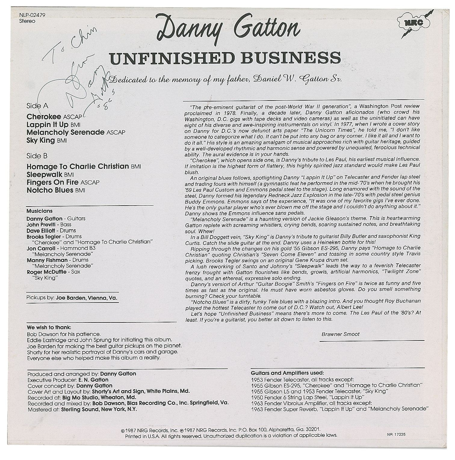 American guitarist (1945–1994) who created a musical style called 'redneck jazz.' His nicknames include 'The Humbler' and 'The Telemaster,' and in 2010, Gibson.com ranked Gatton as the 27th best guitarist of all time. Unfinished Business album signed and inscribed on the back cover in black ballpoint, "To Chris, from Danny Gatton." In fine condition. The record is included.
