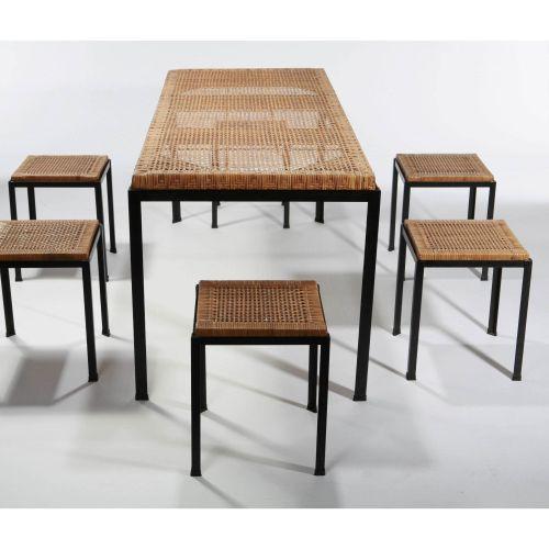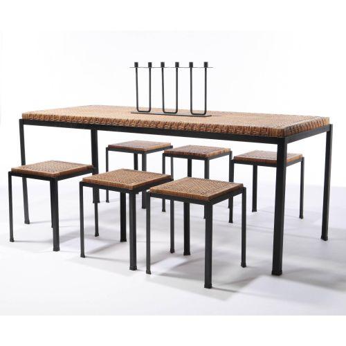 Artist Name: Danny Ho Fong<BR>Manufacturer: Tropi-Cal<BR>Description: "Osetsu Dei" dining suite<BR>Circa: designed circa 1960<BR>Medium: <BR>Signature: <BR>Measurements: 28"h x 72" x 36"<BR>Edition: <BR>Notes: Comprised of a table and 6 square stools<BR>L