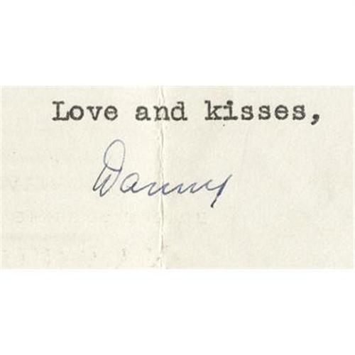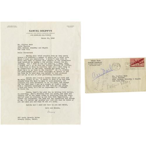 <B>Danny Kaye Signed Letter to Clifton Webb.</B></I> A single-page typed letter from Danny Kaye to Clifton Webb on Samuel Goldwyn stationery, dated March 26, 1943, signed by Kaye in blue ink. It reads in part: "I haven't been able to write very much to anyone else because of the tremendous task involved in making a few million dollars for Mr. Goldwyn. But I said to him one morning, I said, 'Sam, I simply can't go on this way without writing to Clifton. I feel that he will be terribly hurt and I must keep up my connections in New York, because who knows when I might have to go back to the theatre?' " In Very Fine to Excellent condition with heavy mailing creases; also included is the original envelope, in Fine to Very Fine condition with mild to moderate wear and tanning.<BR><BR><b>Shipping:</b> Flat Material, Small (<a target="_blank" href="http://www.heritageauctions.com/common/shipping.php">view shipping information</a>)