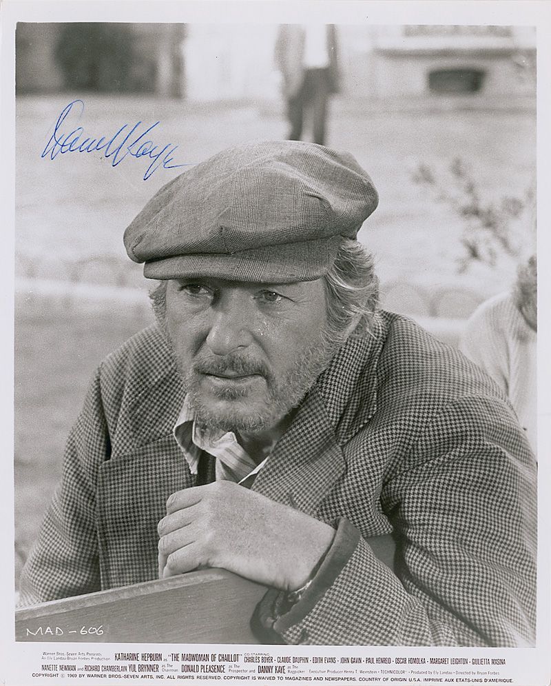 Glossy 8 x 10 Warner Bros. promotional photo of Kaye in The Madwoman of Chaillot, signed in blue felt tip. In fine condition, with a trivial tear to the bottom border and slight irregular adhesion to the signature.