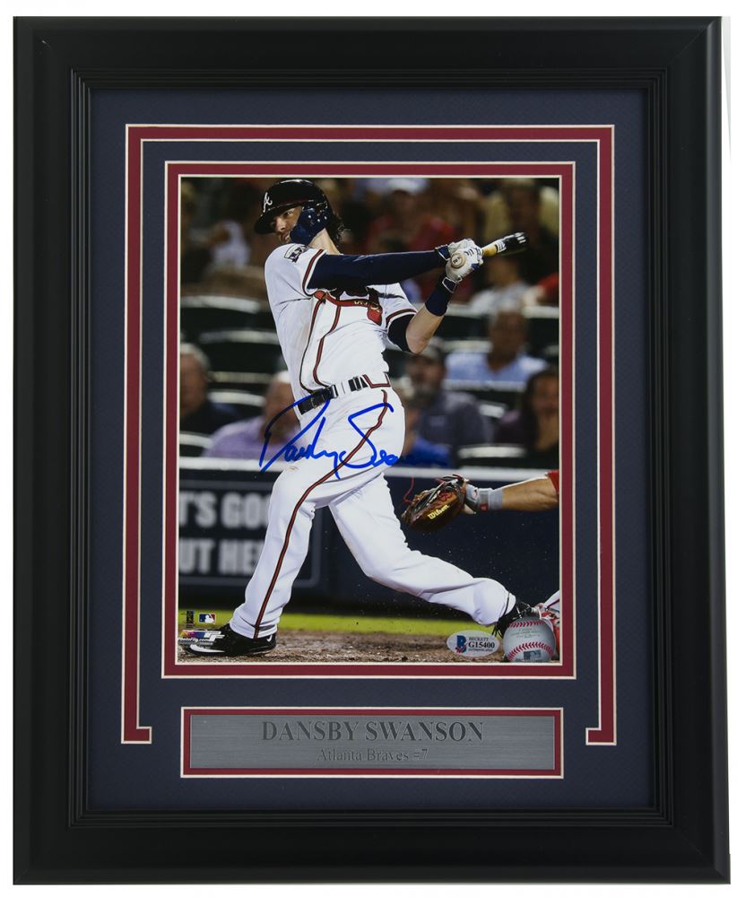 The custom display measures 11" x 14" in size and features a photo that has been hand-signed in blue felt-tip pen by Dansby Swanson.
