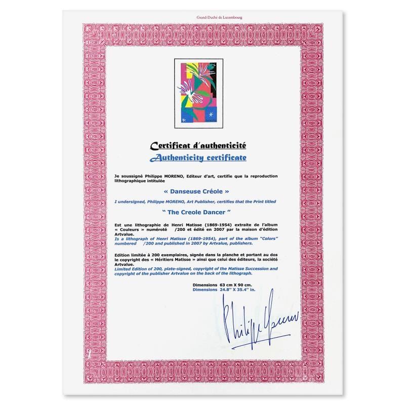 "Danseuse Creole" is a limited edition lithograph by Henri Matisse (1869-1954), bearing the plate signature of the artist. This piece comes from an edition of 200 authorized by the Matisse Estate; the edition number is not on the piece itself but on the certificate. Includes Certificate of Authenticity. Measures approx. 25" x 35.5" (image).