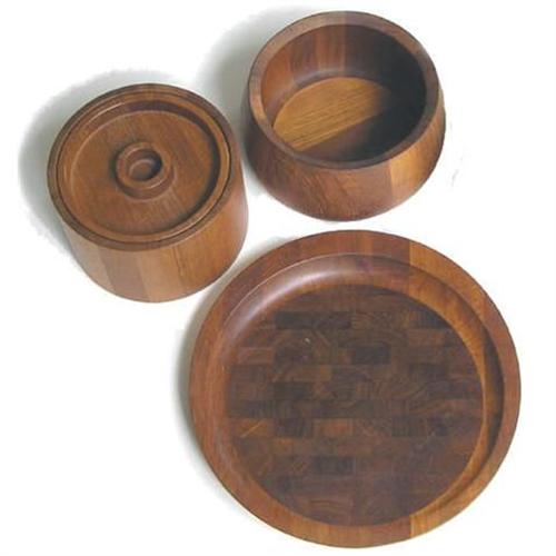 Included in this listing of vintage Dansk pieces are two teakwood ice buckets, a salad bowl and meat or cheese platter. Specifications: ice buckets, 9" diameter x 6" high; platter, 15.5" diameter; salad bowl, 10.25" diameter x 5.5" high. This is one of a couple small Dansk teakwood lots we currently have for sale.