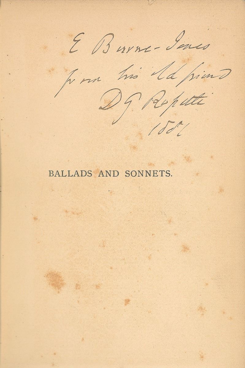 Signed book: Ballads and Sonnets. First edition. London: Ellis and White, 1881. Hardcover, 5.5 x 7.725, 335 pages. Signed and inscribed on the half-title page in ink, “E. Burne-Jones, from his old friend, D. G. Rossetti, 1881.” Burne-Jones’s bookplate is affixed to the front pastedown, as is a later owner’s. Autographic condition: very good. Book condition: VG-/None. Rossetti and Burne-Jones were two leading figures of the Pre-Raphaelite artistic movement—an excellent association copy.
