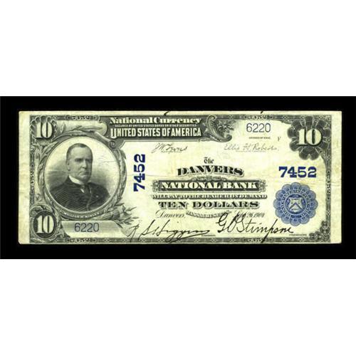 <B>Danvers, MA</B></I> - $10 1902 Plain Back Fr. 624 <B>The Danvers NB</B></I> Ch. # 7452<BR> A very scarce bank which had a meager $830 outstanding in large notes by 1935. Other than one uncut sheet, which is well ensconced in a long term holding at this writing, this new to the census example is the sole Plain Back extant. Nice <B>Very Fine.</B></I><BR><BR><b>Shipping:</b> Coins & Currency (<a target="_blank" href="http://www.heritageauctions.com/common/shipping.php">view shipping information</a>)